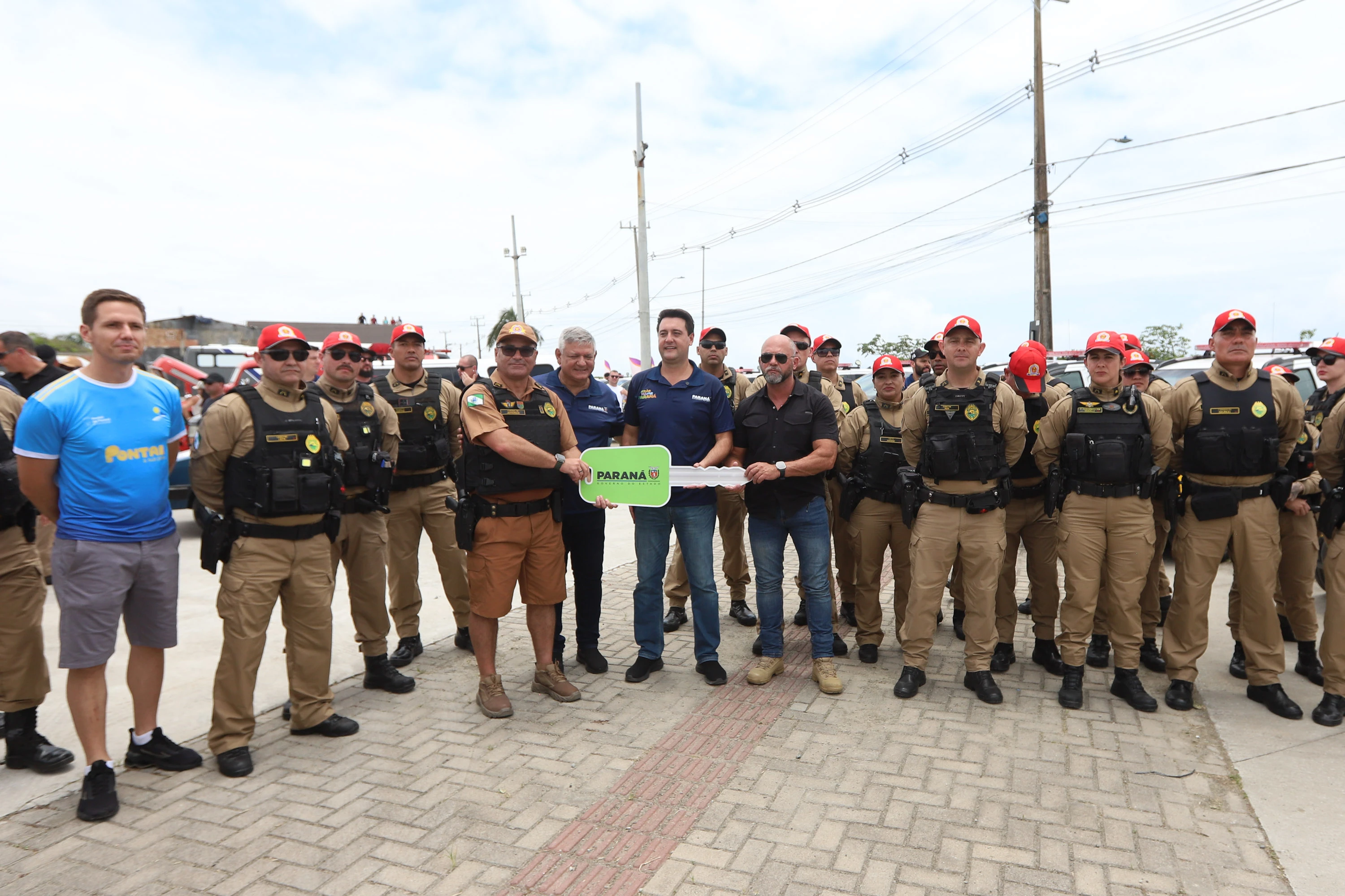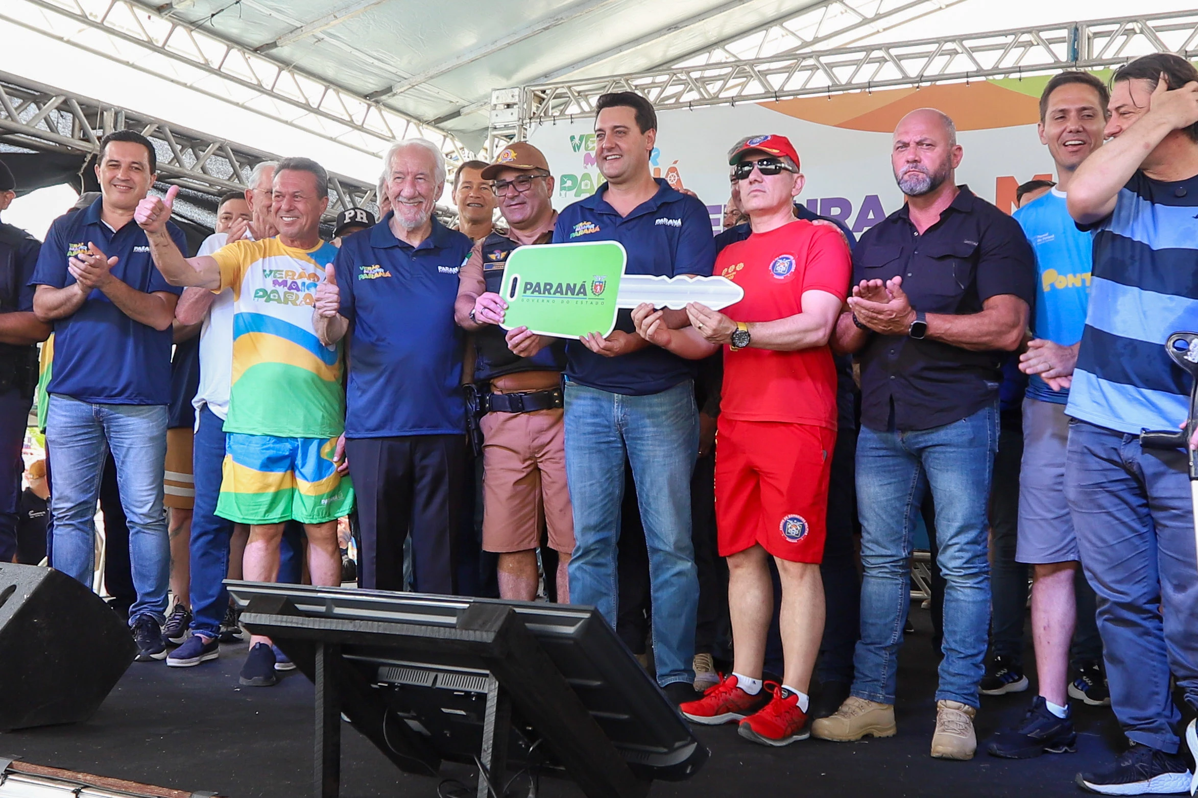 durante a abertura do Verão Maior Paraná, em Pontal do Paraná, no Litoral, uma série de equipamentos para o Corpo de Bombeiros Militar (CBMPR), no valor de R$ 5 milhões.