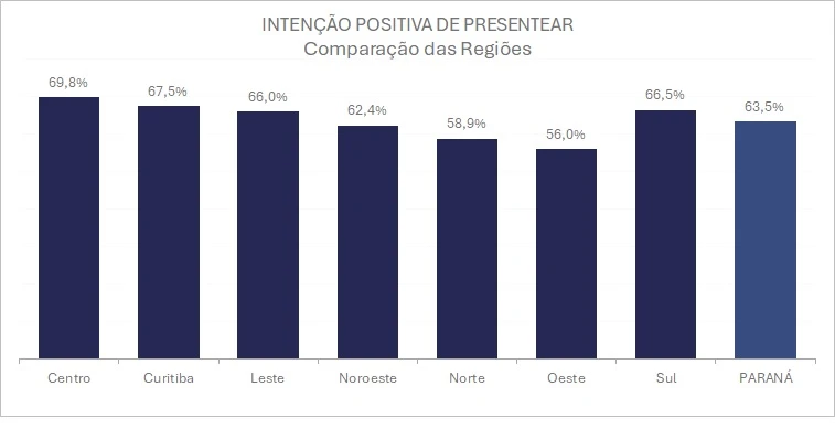 Os consumidores mais animados para as compras de Natal são os do Centro, que abrange os municípios da região de Guarapuava e Campos Gerais, com 69,8% de intenções positivas. Logo em seguida vêm os curitibanos, empolgados com o clima da “Capital do Natal”, com 67,5% de respostas afirmativas. Na sequência estão os moradores das regiões Sul (66,5%), Leste (66%), Noroeste (62,4%), Norte (58,9%) e, por fim, Oeste (56%).