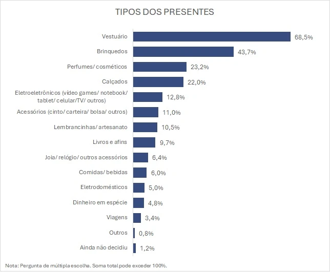 Os itens de vestuário lideram a lista dos mais procurados, sendo mencionados por 68,5% dos entrevistados. Os brinquedos aparecem em seguida, com 43,7% das intenções de compra. Perfumes e cosméticos (23,2%), calçados (22%), eletroeletrônicos (12,8%), acessórios (11%), lembrancinhas ou artesanato (10,5%) e livros (9,7%) também figuram entre as opções mais citadas.