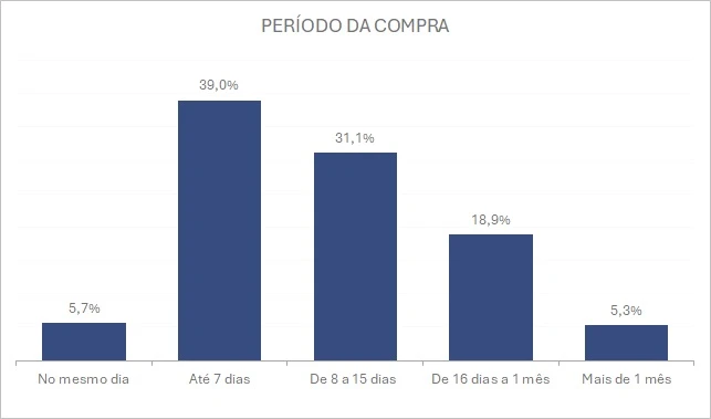 A maior movimentação no comércio deve ocorrer na semana que antecede o Natal, com 39% dos consumidores planejando adquirir presentes neste período. Outros 31,1% devem realizar suas compras de oito a 15 dias antes, enquanto 18,9% se anteciparão entre 16 dias e um mês antes da data. Praticamente na mesma proporção figuram os dois extremos: os que deixarão para a última hora, comprando no próprio dia da ceia natalina, com 5,7%, e os que já garantiram seus presentes, com 5,3%.