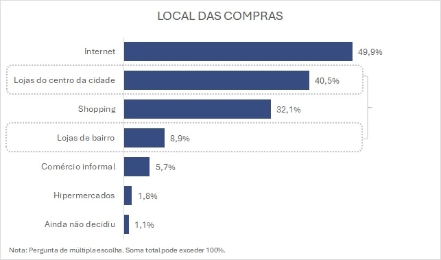 A internet lidera as preferências de compra dos paranaenses, com 49,9%. Em seguida, o comércio de rua mantém forte presença, com 49,4% das menções, sendo as lojas do centro responsáveis por 40,5% e as lojas de bairro por 8,9%. As compras em shoppings também são relevantes, representando 32,1% da predileção dos consumidores.