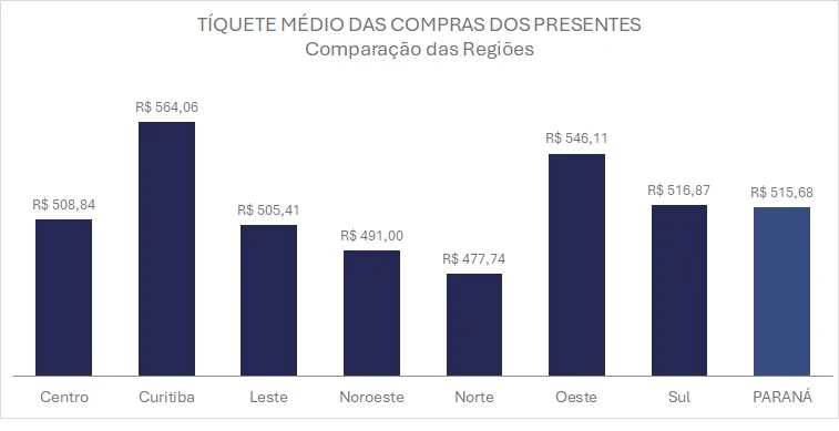 Os curitibanos terão o maior tíquete médio do estado, com estimativa de gastar R$ 564,06 em presentes este ano. Apesar de menos propensos à troca de presentes, os consumidores da região Oeste devem despender em média R$ 546,11 nas compras de Natal. Os mais econômicos serão os moradores da região Norte, que planejam gastar cerca de R$ 477,74 em presentes. Na região Sul o tíquete médio será de R$ 516,87; no Centro, de R$ 508,84; na região Leste, o gasto médio será de R$ 505,41, e no Noroeste, de R$ 491,00.