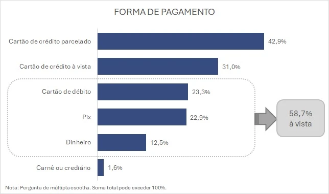 As formas de pagamento à vista devem ter a preferência, somando 58,7% das citações, entre cartão de débito (23,3%), Pix (22,9%) e dinheiro (12,5%). As compras no cartão de crédito parcelado serão a opção para 42,9% dos consumidores e o pagamento no vencimento, 31%. Apenas 1,6% planeja usar carnê ou crediário.