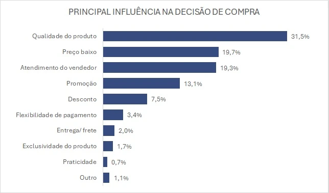 A qualidade do produto é o principal fator de decisão para 31,5% dos paranaenses, superando o preço, que foi mencionado por 19,7%. O atendimento do vendedor também tem um peso significativo, sendo decisivo para 19,3% dos entrevistados, o que ressalta a importância de uma equipe de vendas bem qualificada.