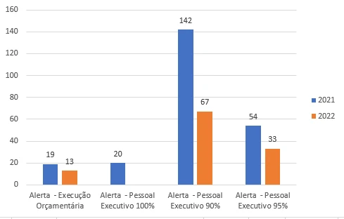 Em 2022, o TCE-PR expediu um total de 100 alertas em relação aos 79 municípios enquadrados em uma ou mais situações previstas na LRF. Em 2021, a Corte havia emitido um total de 216 alertas aos 133 Executivos que excederam limites de gasto com pessoal.