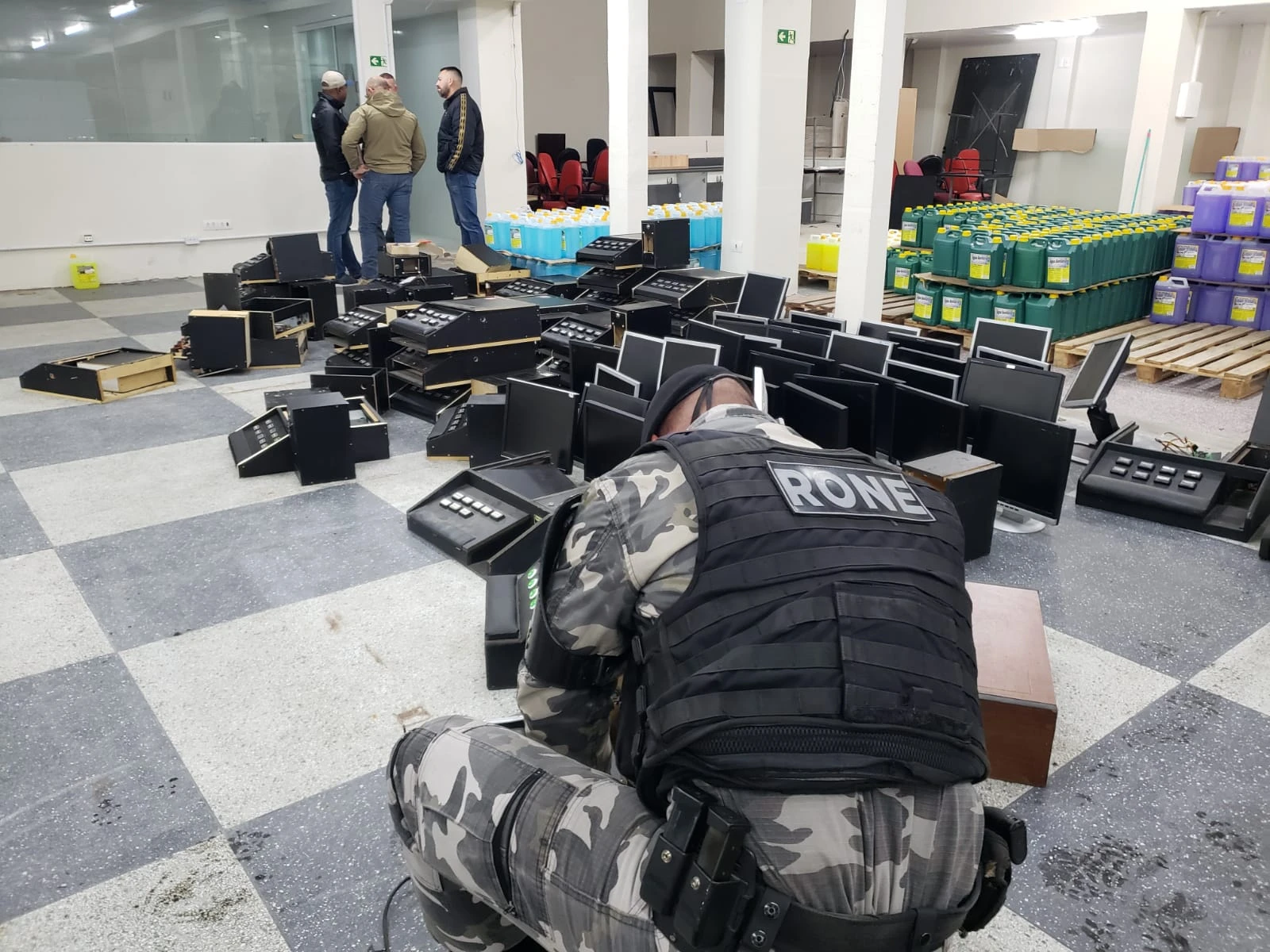 A ação, que ficou a cargo do Batalhão de Polícia de Rondas Ostensivas de Natureza Especial (BPRONE) teve desdobramento e mais 56 máquinas caça-níquel foram localizadas em um segundo endereço, um galpão na Rua Capiberibe, no Santa Quitéria. No local, foram também apreendidas máquinas de cartão bancário e de jogo do bicho, isolamento acústico e objetos da prática de jogos de azar.