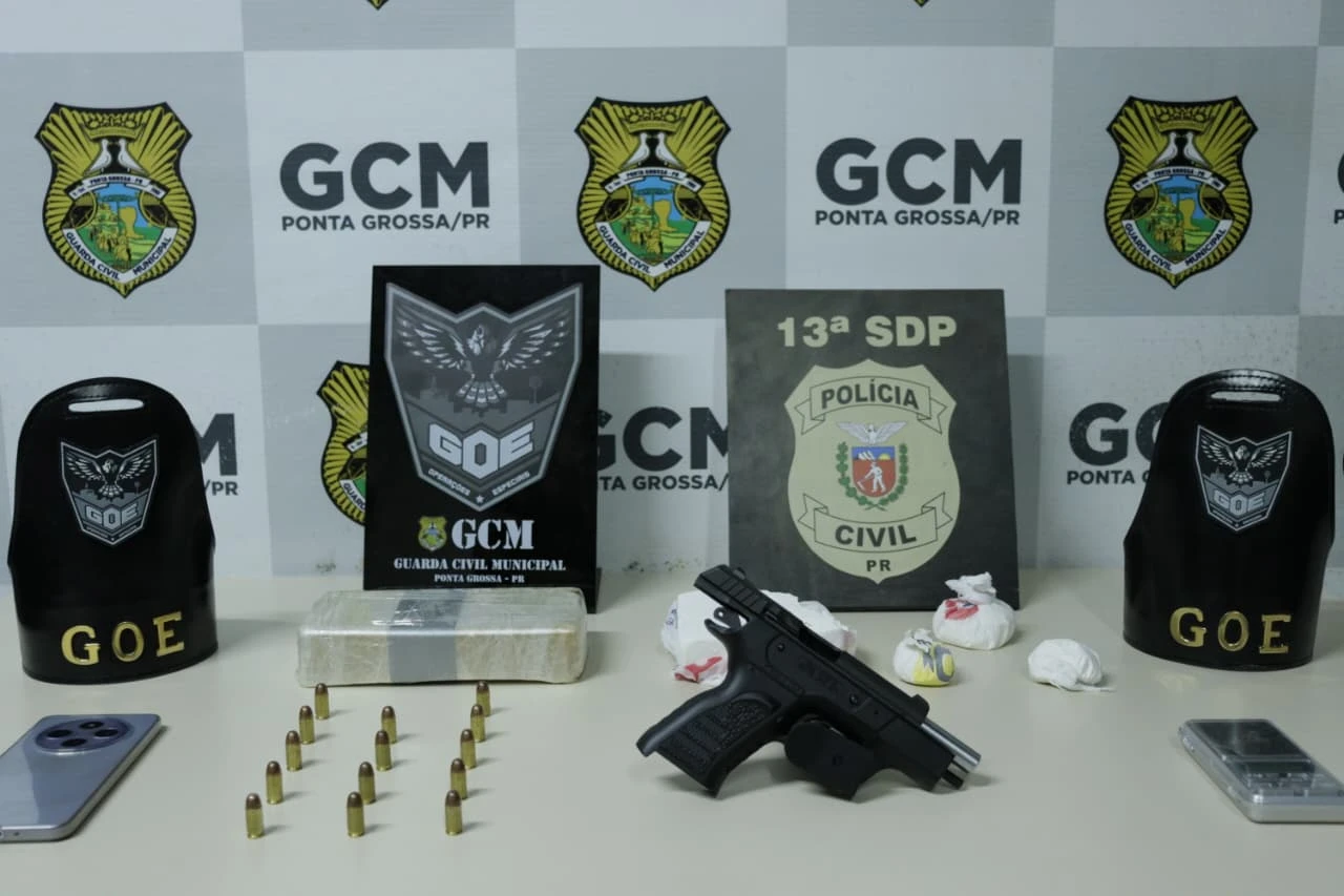 Uma operação conjunta realizada na madrugada desta quarta-feira (19) pela Guarda Civil Municipal de Ponta Grossa, por meio do Grupamento de Operações Especiais (GOE), e pelo setor operacional da Polícia Civil resultou na prisão de um homem foragido da Justiça e na apreensão de arma de fogo e entorpecentes em uma residência no Bairro Boa Vista.