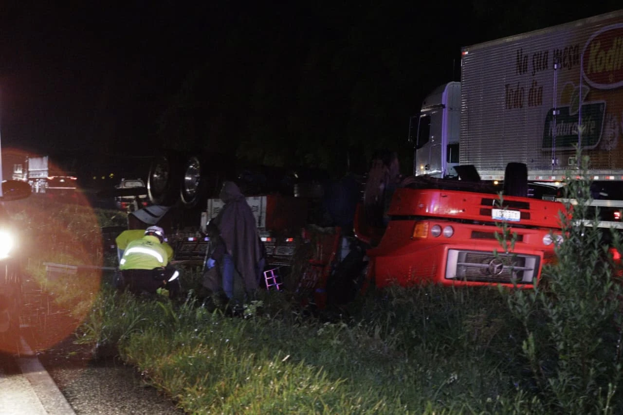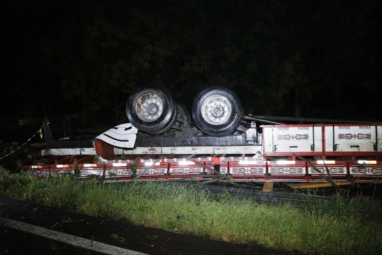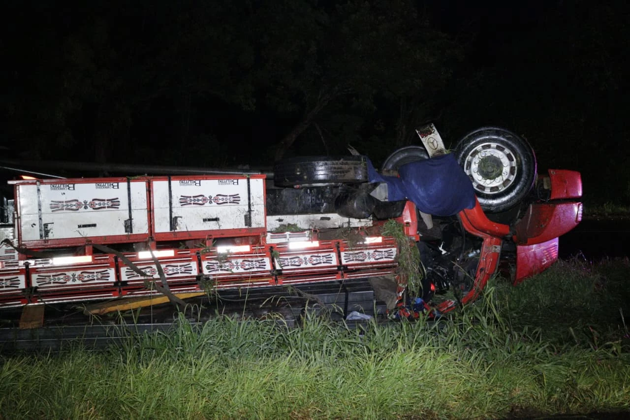 Um terceiro caminhão - Mercedez Benz vermelho carregado com barras de ferro - tentou desviar do acidente e acabou indo em direção ao canteiro central da pista. O veículo capotou e o motorista, de 21 anos, faleceu ainda no local.