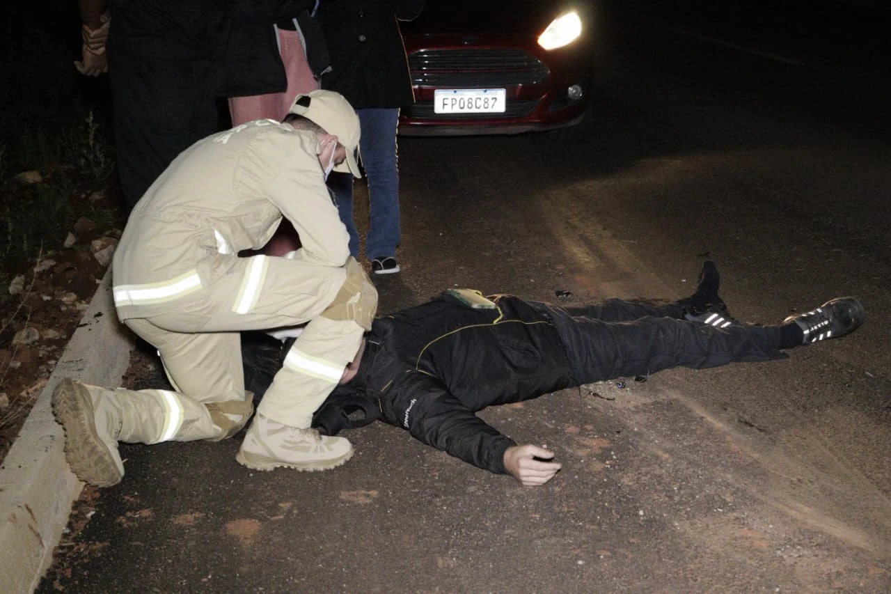 Equipes do Siate (Corpo de Bombeiros) foram acionadas para atender à ocorrência classificada como Colisão Auto/Moto. No local, foi constatado que o homem havia sofrido várias contusões pelo corpo, mas sem ferimentos graves. Ele foi encaminhado à Unimed, consciente e orientado, com lesões leves e sem lembrar exatamente como o acidente aconteceu.