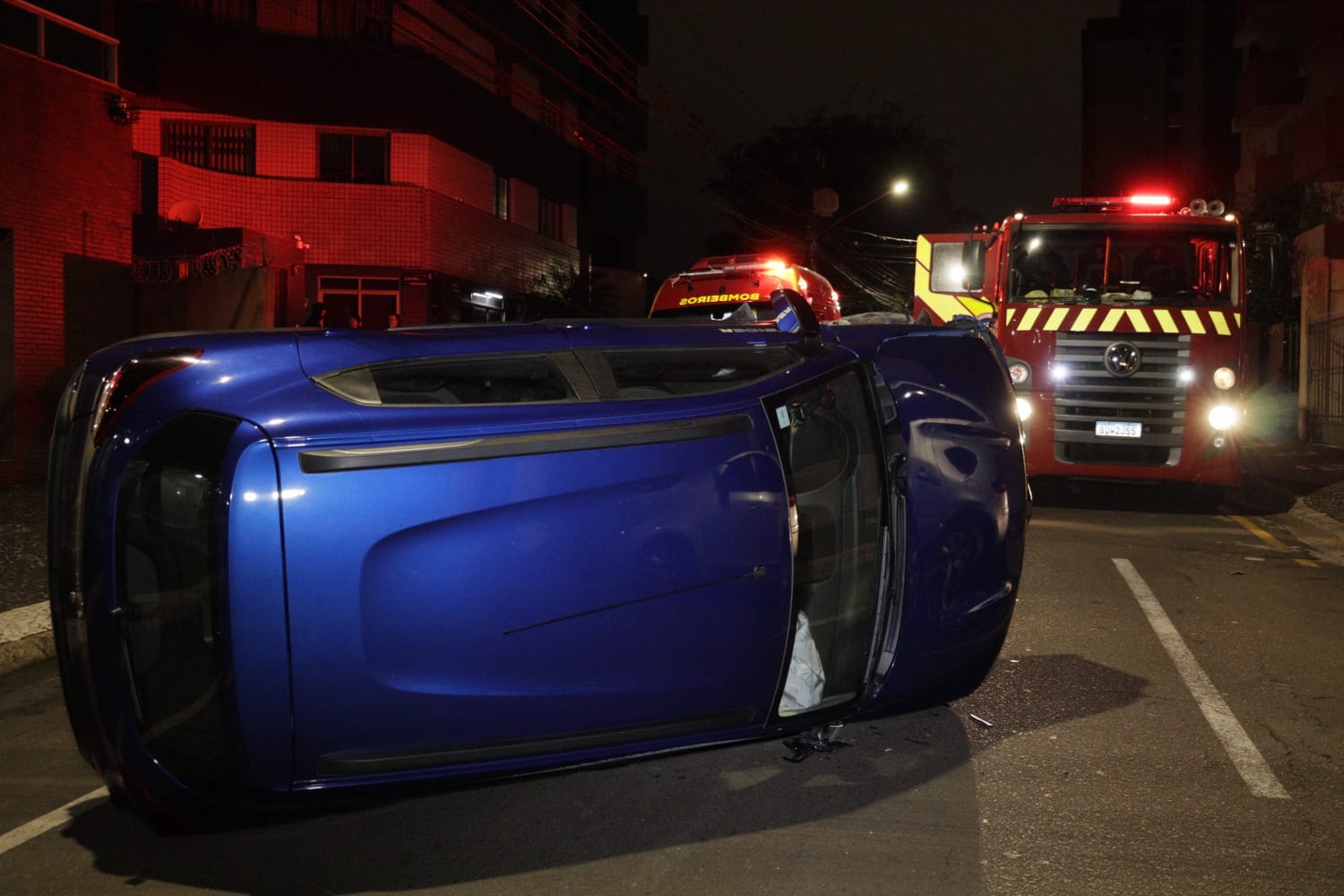 Um Renault Kwid azul, que seguia pela Rua Benjamin Constant no sentido bairro, colidiu contra um veículo C4 prata que estava estacionado no lado esquerdo da via. Após a colisão, o Renault Kwid tombou.