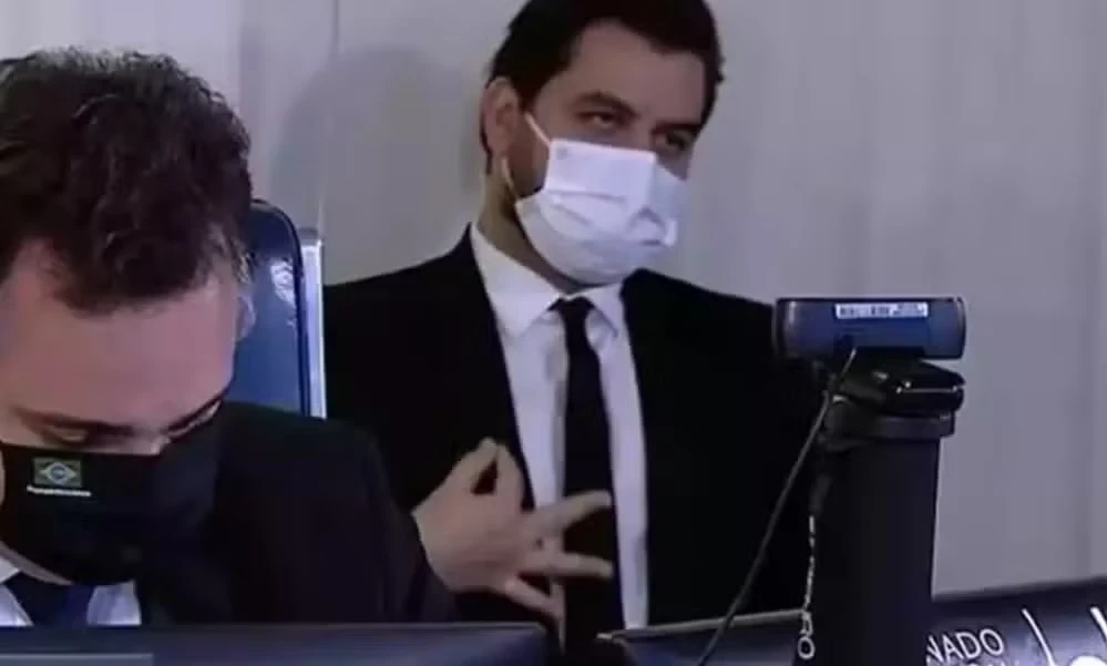 O gesto foi flagrado pelas câmeras da TV Senado enquanto Martins estava atrás do presidente do Senado, Rodrigo Pacheco. Confira abaixo: