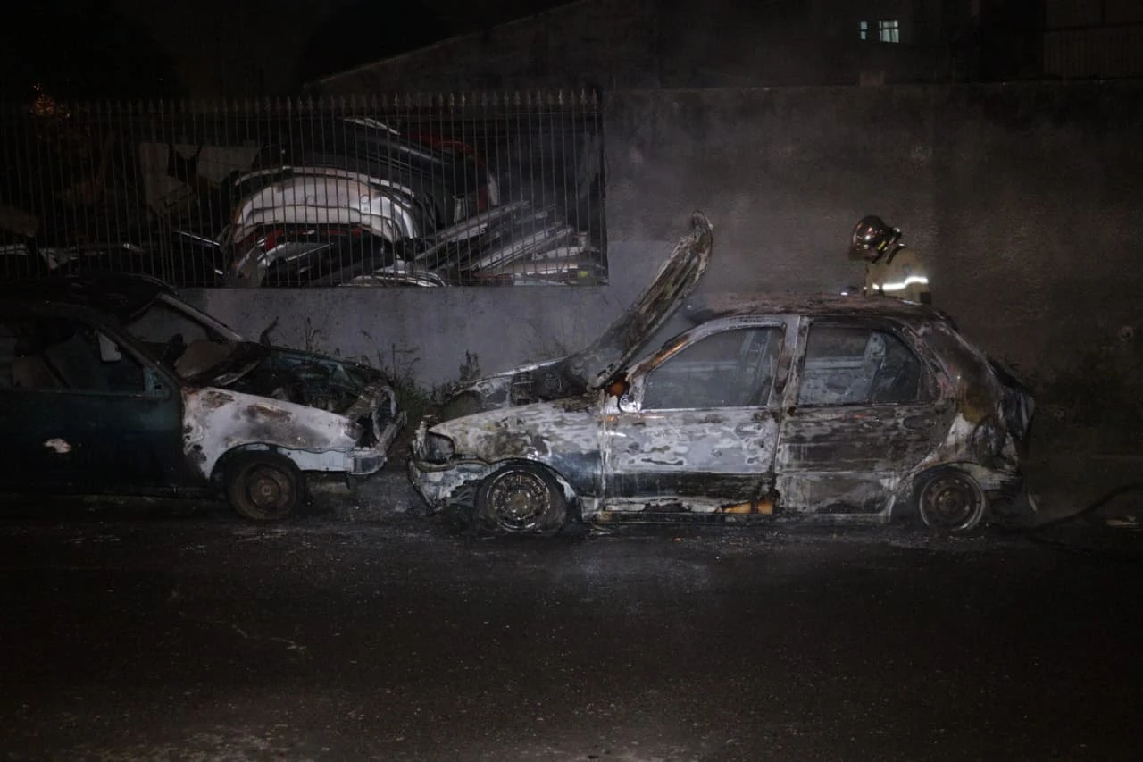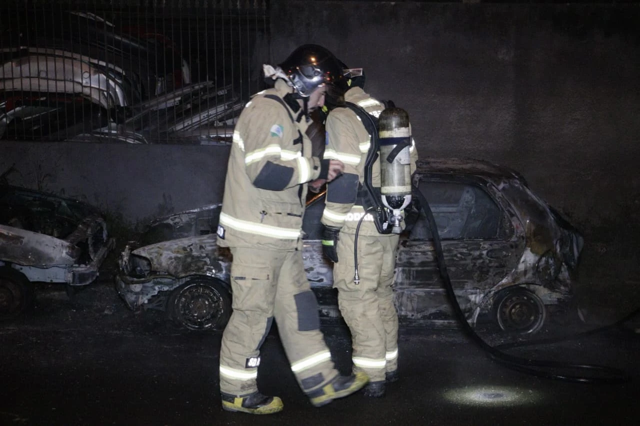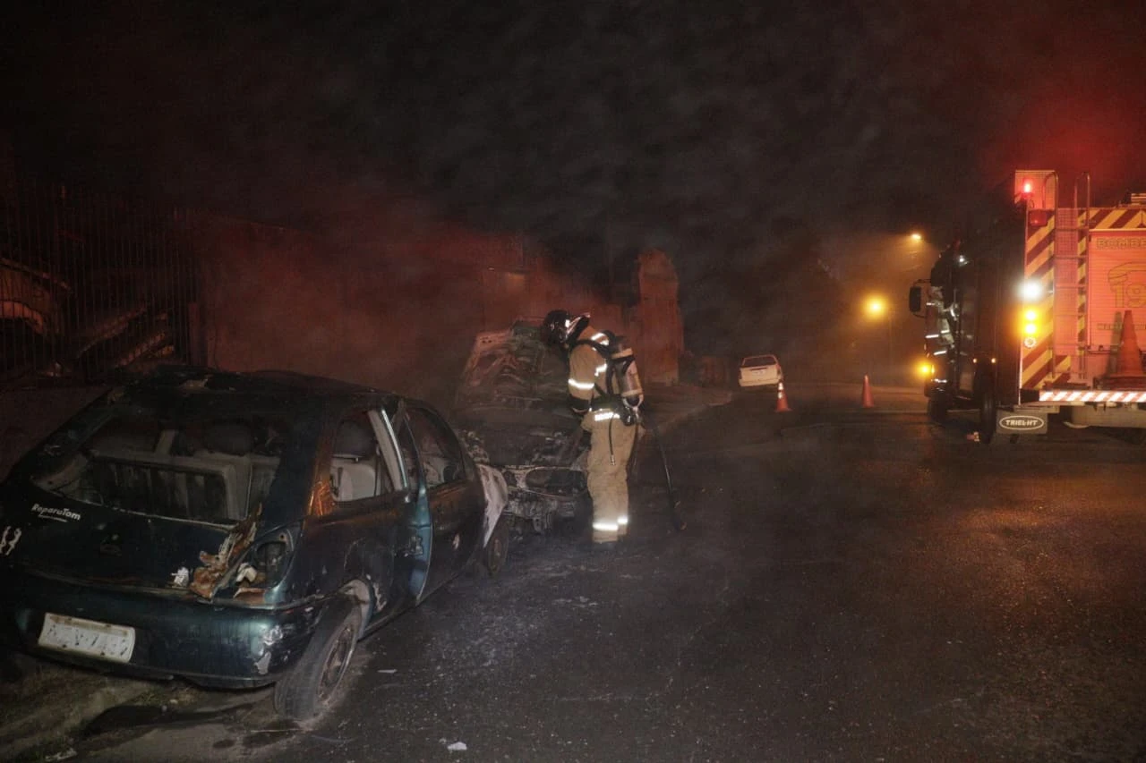 Ao chegar no local, os bombeiros constataram que dois veículos estavam em chamas. Um Ford Fiesta sofreu danos apenas na parte dianteira. De acordo com informações colhidas no local, o carro não possuía motor e seria vendido como sucata. Já o segundo veículo, um Fiat Palio, foi completamente consumido pelo fogo.