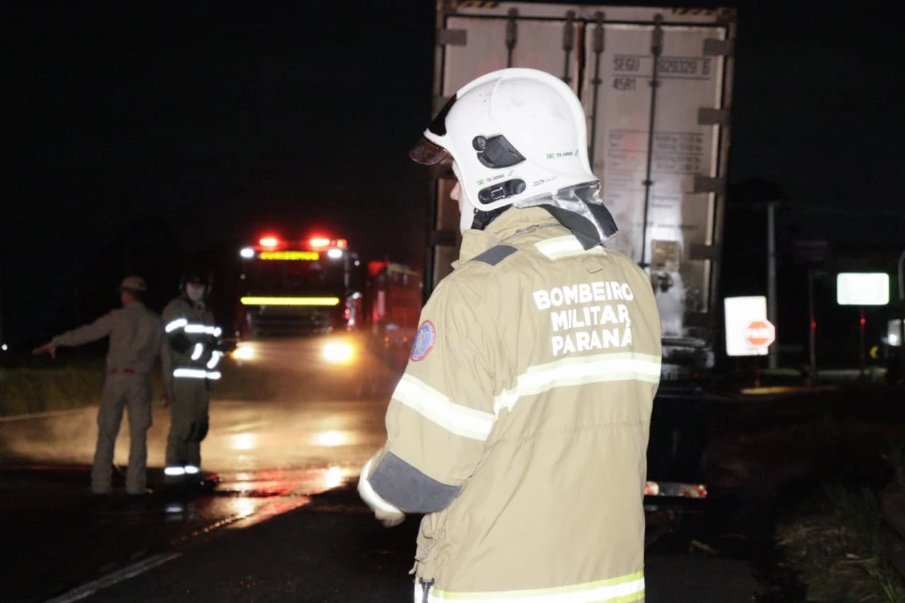 Um incêndio atingiu o rodado de uma carreta frigorífica carregada com frangos na BR-376, km 496, sentido Curitiba, nas proximidades da Churrascaria Zancanaro, durante a madrugada desta segunda-feira (17).