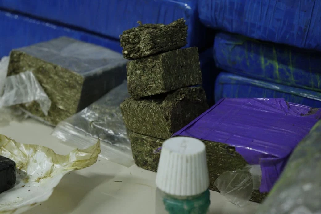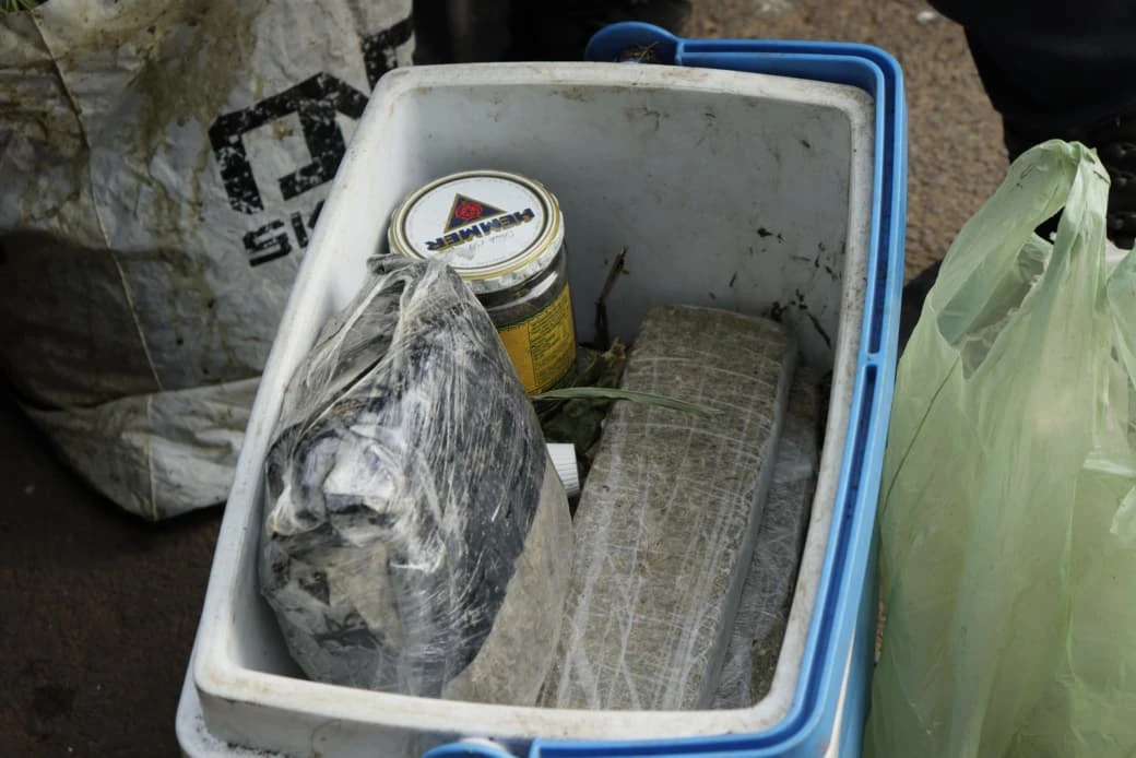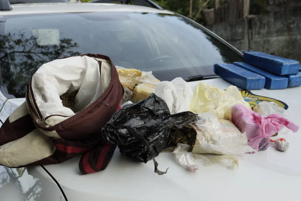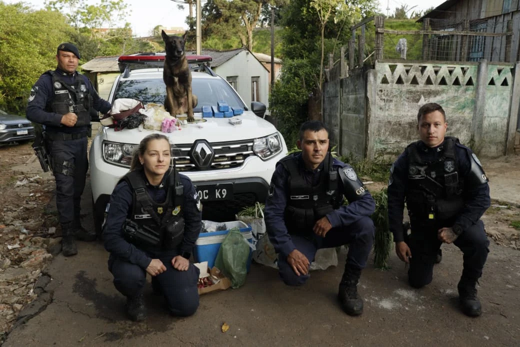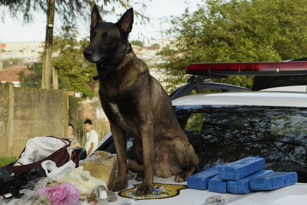 Diante da situação, foi empregado o cão policial Bolt para uma varredura nas imediações. Durante o procedimento, o cão sinalizou em direção a uma área de mata, onde a equipe localizou uma grande quantidade de substâncias entorpecentes: