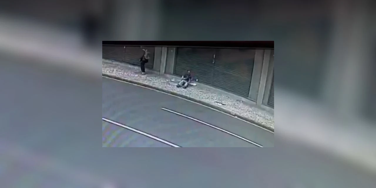 Imagens do ataque mostram o suspeito se aproximando da vítima, de 43 anos, que estava deitada na calçada, e fazendo um movimento próximo ao rosto dela. Em seguida, a vítima se agita e, logo depois, chamas aparecem no tórax. O vídeo também registra que uma pessoa presente se afasta sem prestar socorro, enquanto outra desce de um carro para ajudar.