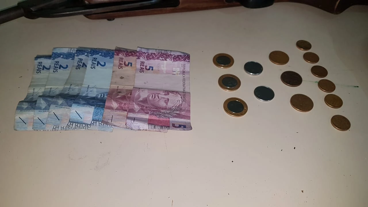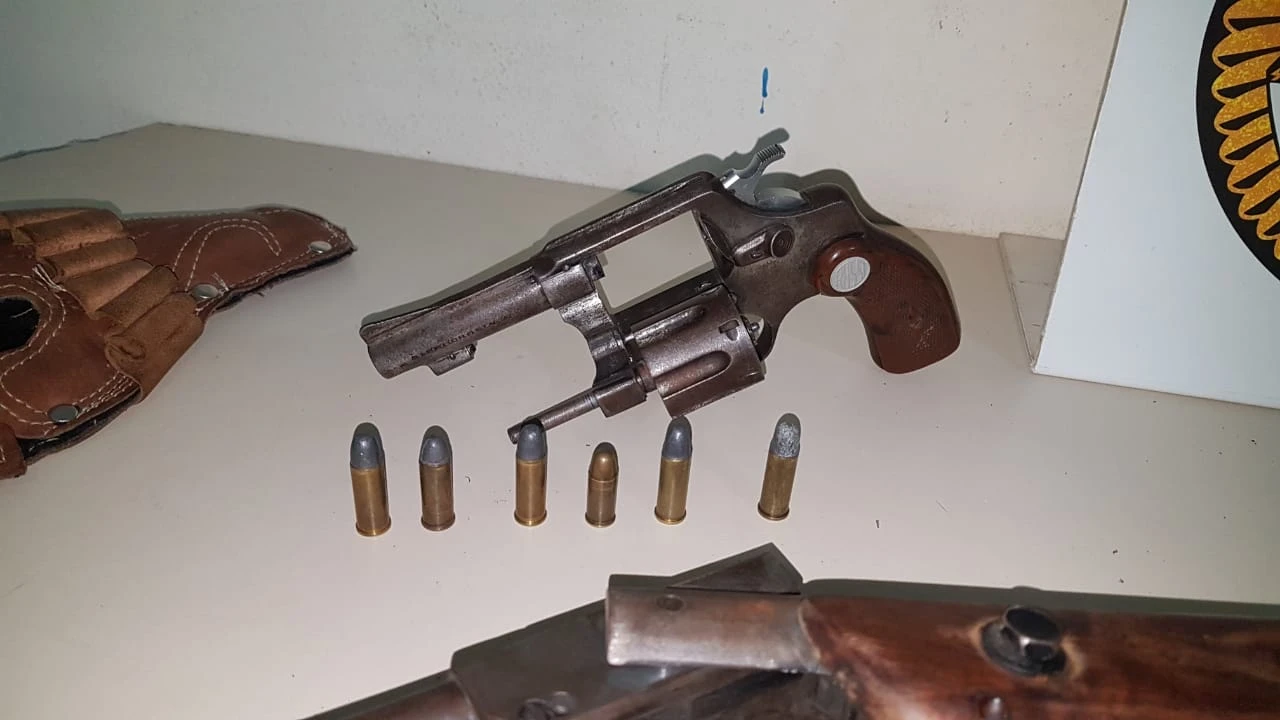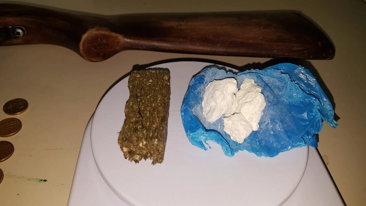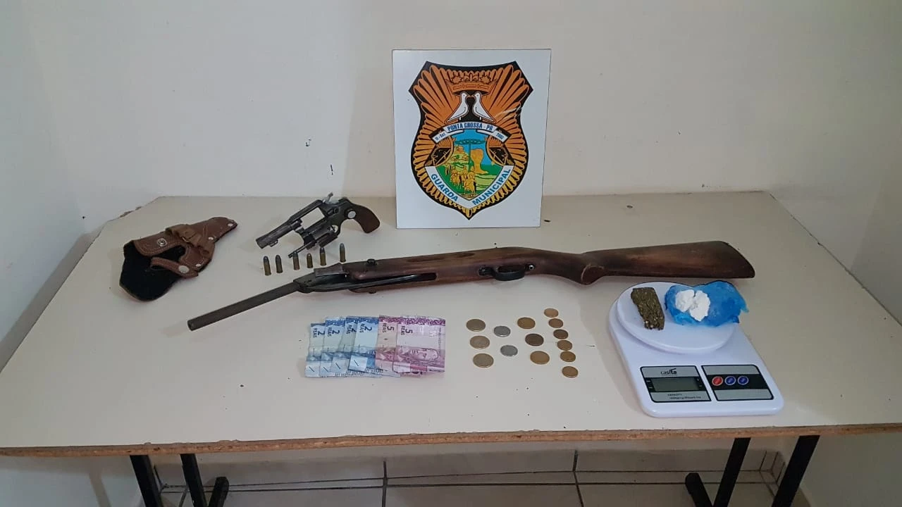 Durante revista feita na residência, foram encontrados um revólver calibre .32 (contendo 6 munições, quatro delas com a espoleta danificada e duas intactas), uma carabina de pressão Rossi calibre .4,5, 24 g de maconha, 14 g de cocaína, uma balança de precisão e R$ 23,35 em notas trocadas.