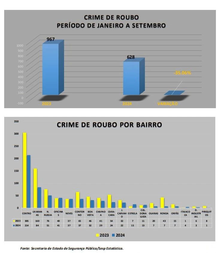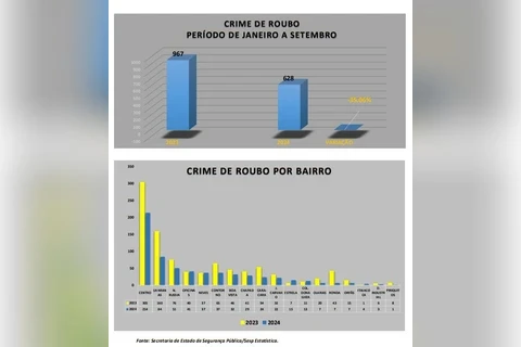 Segundo o levantamento, o registro de roubos na cidade caiu de 967 ocorrências em 2023 para 628 em 2024.