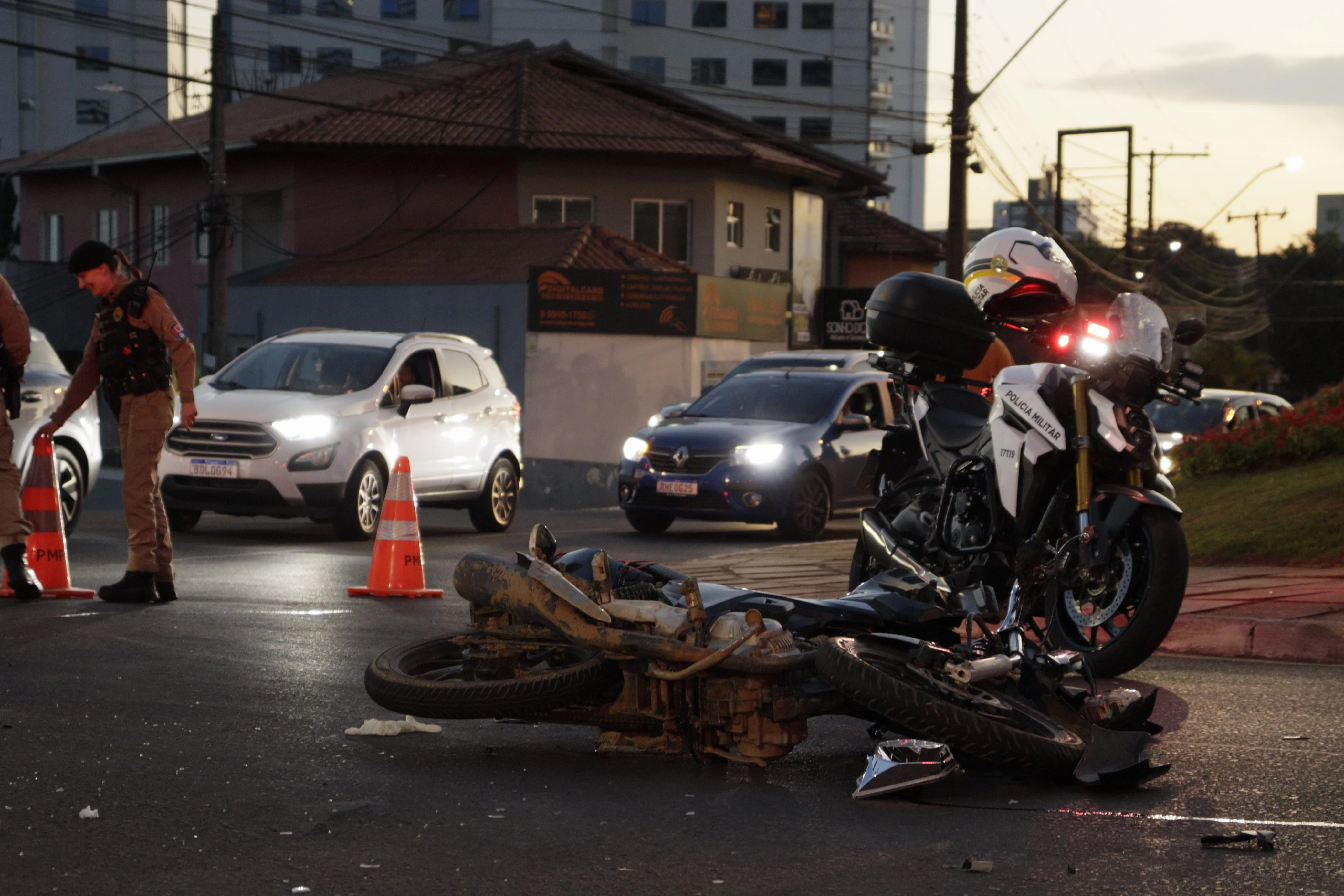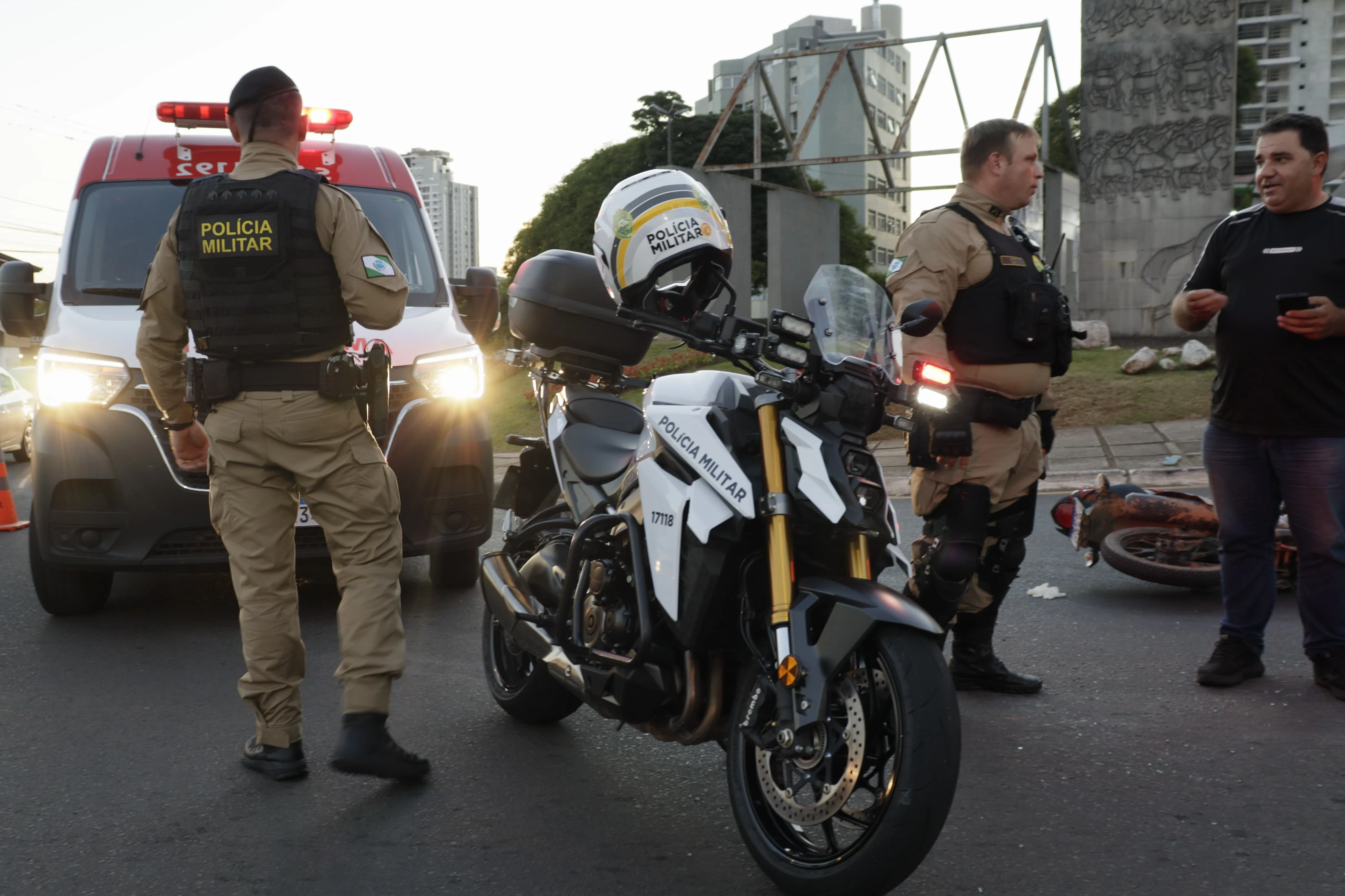 O acompanhamento se estendeu até a região central. O piloto, de 19 anos, seguiu pela Rua Silva Jardim e, ao chegar na Rotatória dos Tropeiros, perdeu o controle da direção. “O indivíduo perdeu o controle da motocicleta e colidiu com um veículo Renault Sandero”, detalhou Scardanzan.