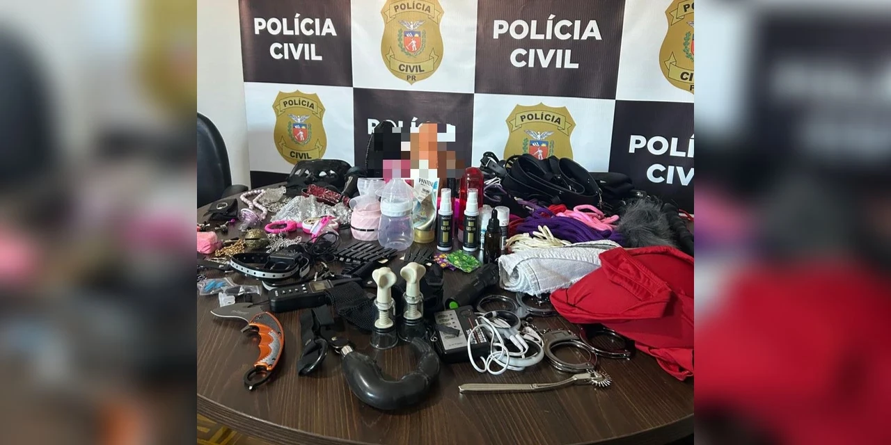 Entre os itens estavam uma maleta contendo apetrechos de cunho sexual, uma máquina de choque, canivete, velas, ganchos, chupetas infantis e chibatas.