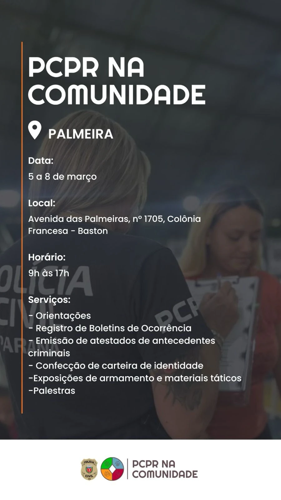 A Polícia Civil do Parará realizará nos dias 05 a 08 de março o evento “PCPR na Comunidade”. O local será nas dependências da Baston Indústria de Aerossóis, sediada na Av. das Palmeiras, nº 1705, Colônia Francesa, Palmeira-PR.