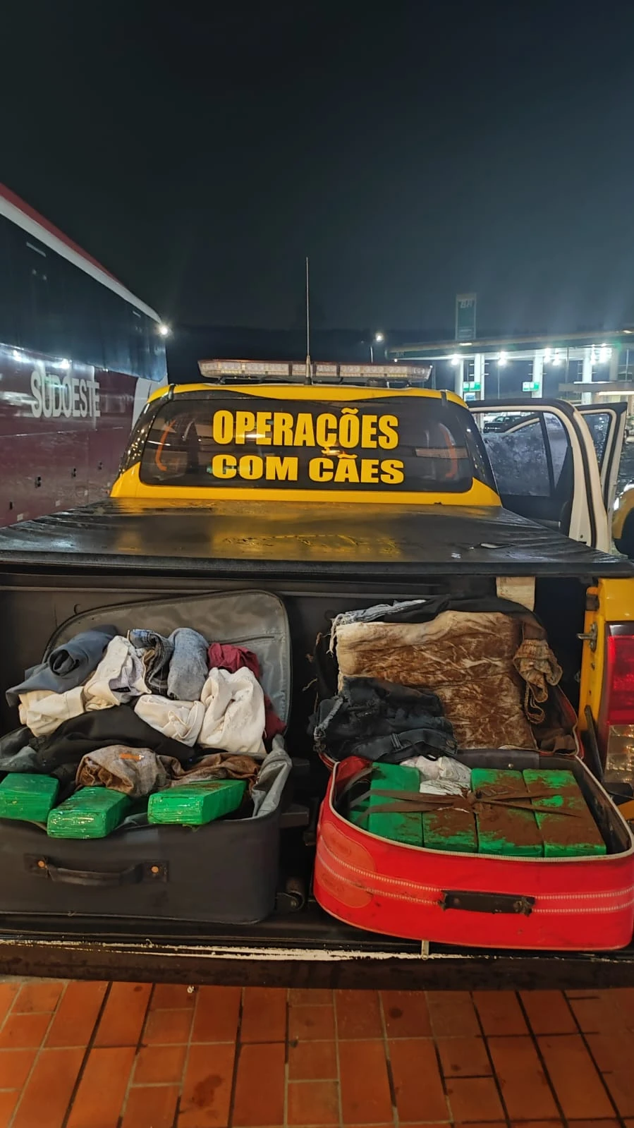 O ônibus do itinerário Foz do Iguaçu a Florianópolis, foi abordado e realizada busca no bagageiro, com ajuda do cão Maximus. O animal indicou a presença de droga em uma das bagagens e, em meio a pertences pessoais, foram localizados tabletes do entorpecente envoltos em fita adesiva verde. Durante a retirada dos tabletes da mala, foi encontrado, dentro de uma meia, um revólver calibre 38.