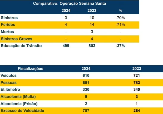 A PRF encerrou à meia noite de domingo (31/03) a Operação Semana Santa 2024 na circunscrição da Delegacia de Ponta Grossa que abrange os postos de Ponta Grossa I (Caetano), Ponta Grossa II (Furnas), Tibagi e Balsa Nova, totalizando 536 km de rodovias. Durante o feriado, que contou com reforço de efetivo em todos os dias, foram fiscalizados 610 veículos, 691 pessoas e realizados 330 testes de etilômetro, o bafômetro. Como resultado dessas fiscalizações, nove motoristas foram flagrados conduzindo o veículo sob efeito de álcool, dois deles sendo encaminhados à Polícia Judiciária por crime de trânsito;76 veículos foram flagrados realizando ultrapassagens indevidas; 787 transitando em excesso de velocidade; 21 ocupantes de veículo não utilizavam o cinto de segurança e oito crianças eram transportadas sem o uso do dispositivo de retenção, a cadeirinha; dois condutores faziam uso do celular enquanto dirigiam. Além desses números, vinte veículos foram removidos para o pátio da PRF por problemas de documentação ou por não apresentarem condições de segurança; e trinta e seis tiveram seus documentos recolhidos para posterior apresentação do veículo regularizado.