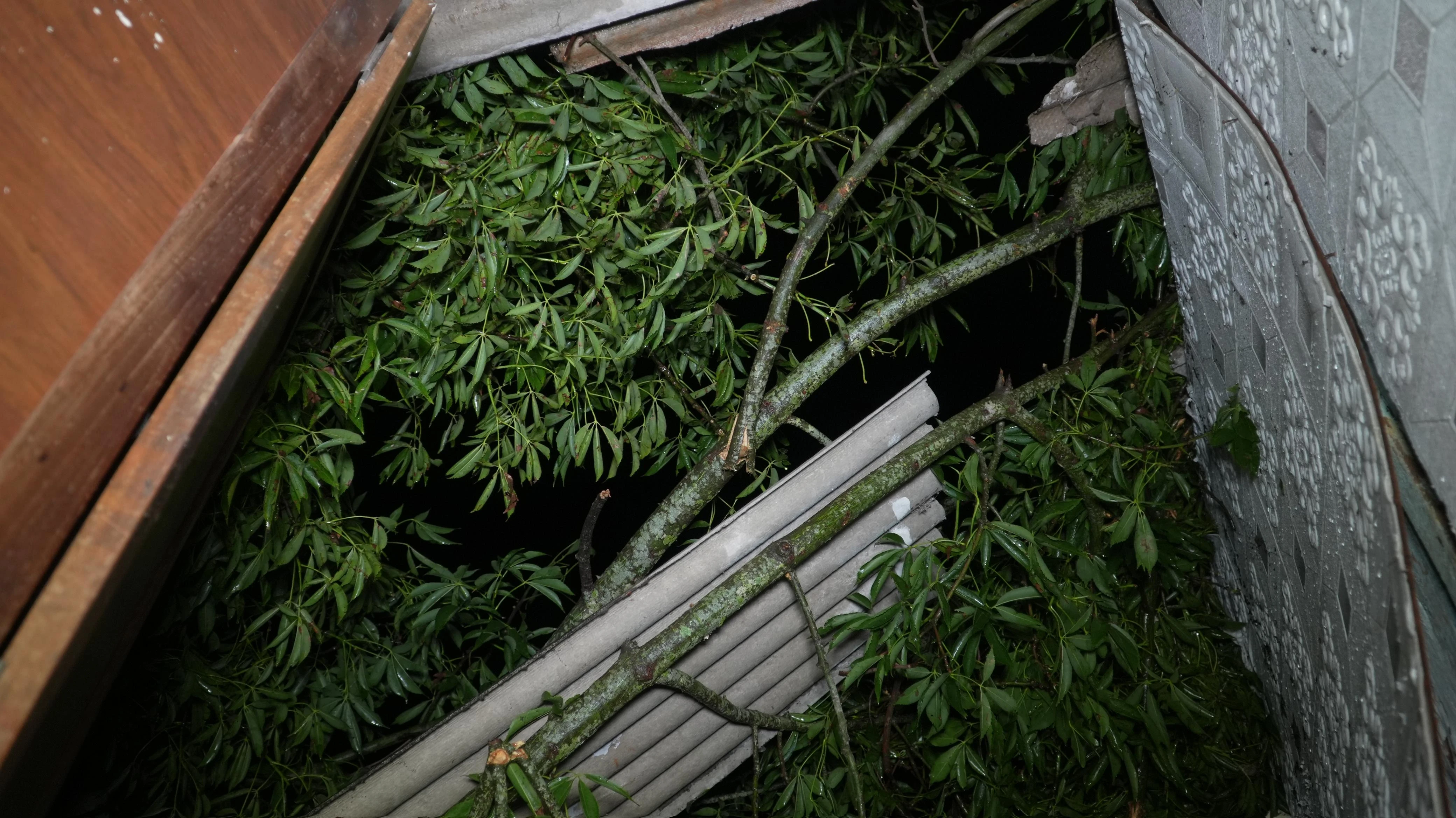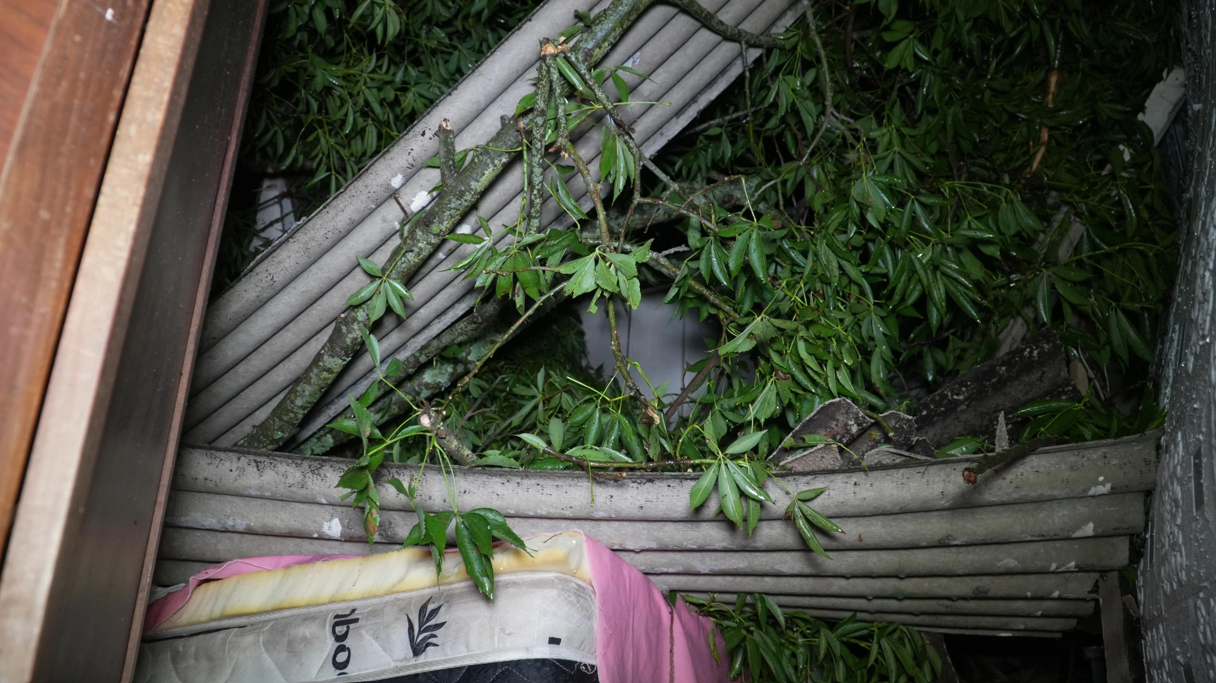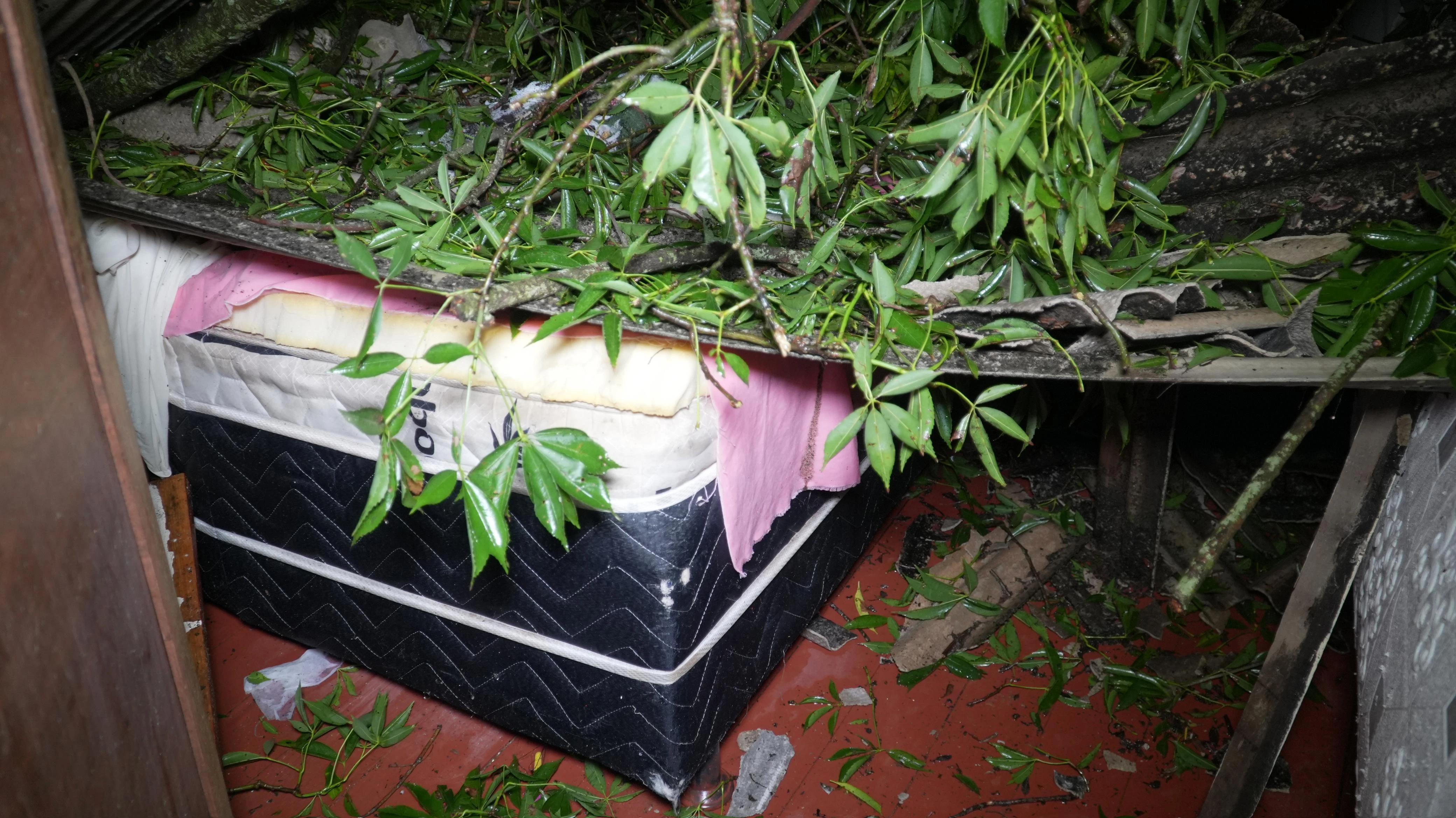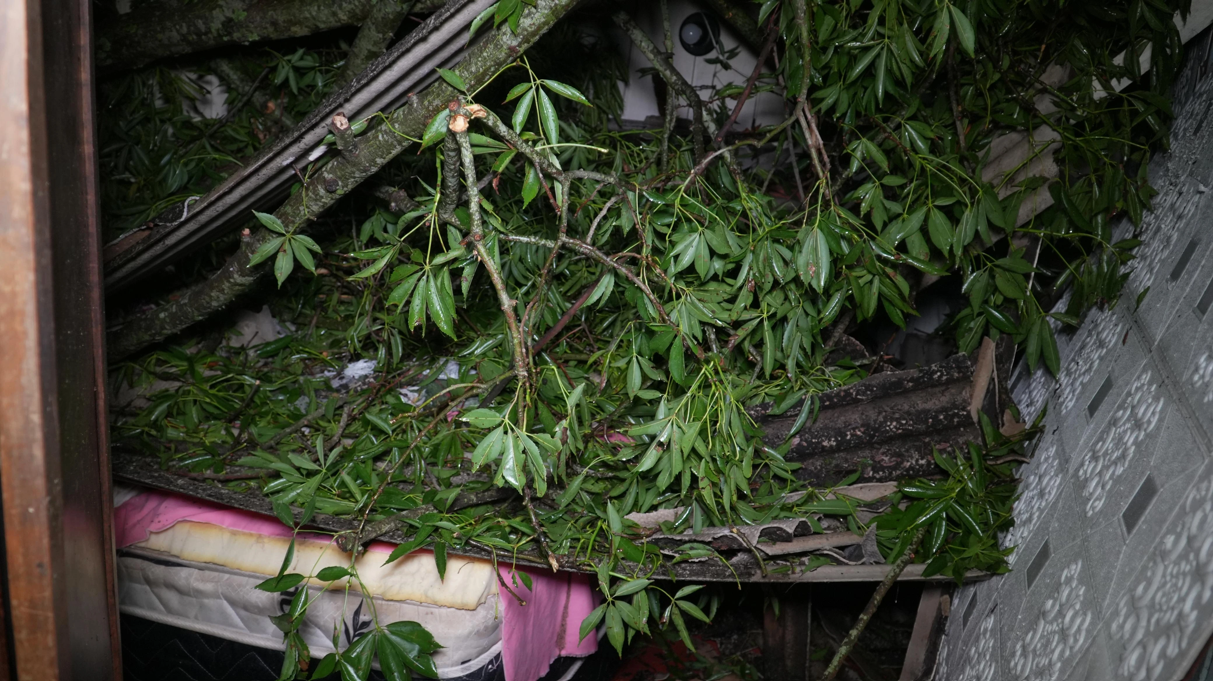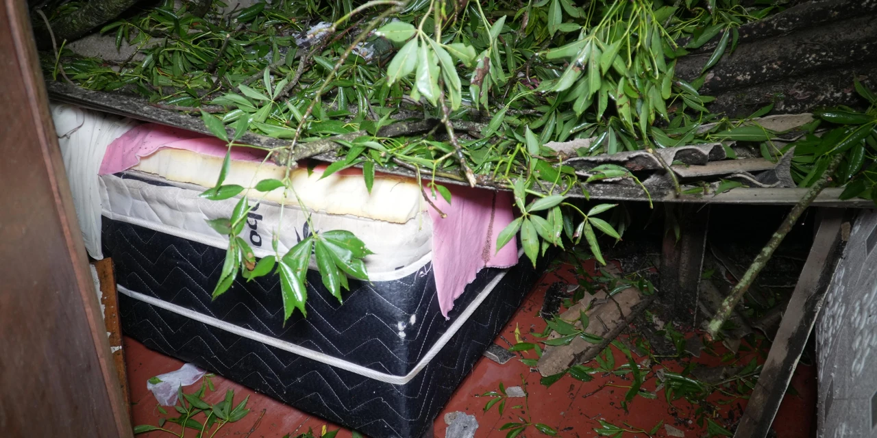 De acordo com informações apuradas pelo repórter Ricardo Marcondes, do D'Ponta News, o caso ocorreu na Rua André Mulanki e necessitou intervenção do Corpo de Bombeiros. Galhos e troncos atingiram diretamente a cobertura e caíram sobre a cama da moradora, causando danos significativos à estrutura do imóvel.
