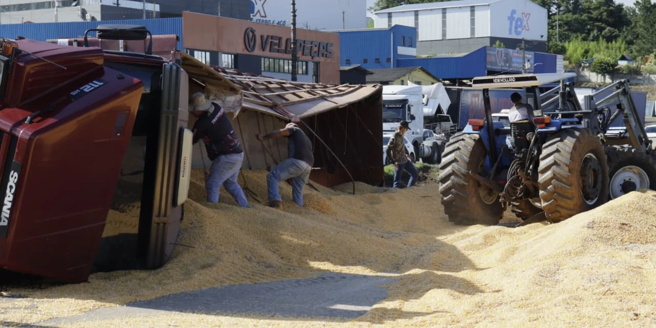 Em uma demonstração de solidariedade, trabalhadores que presenciaram o acidente na Avenida Presidente Kennedy uniram forças para desobstruir a rodovia na tarde desta segunda-feira (9). Conforme imagens registradas pela equipe do D'Ponta News, um trator está sendo utilizado para remover a grande quantidade de milho que ficou espalhada por ambas as pistas após o caminhão invadir o sentido contrário e tombar.