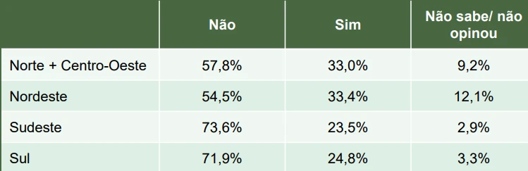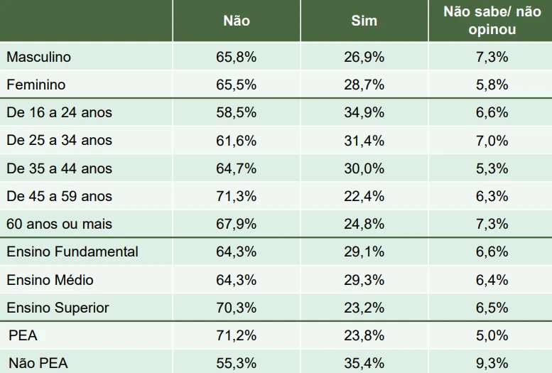 A pesquisa também estratificou os dados entre gênero, idade, formação escolar e região. Confira: