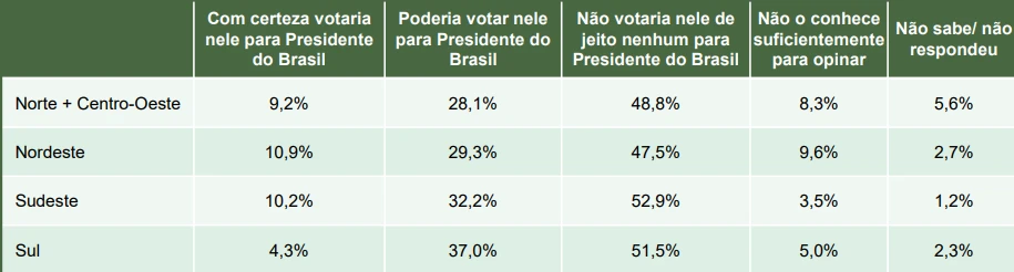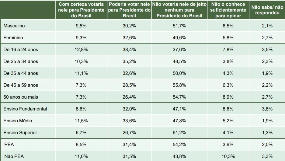 Conforme os dados apresentados, 50,6% dos eleitores não votariam no cantor de jeito nenhum; 31,5% poderiam votar e 9,4% com certeza votariam - não conhece suficientemente para opinar registrou 6,1% e não sabe/não respondeu, 2,4%.