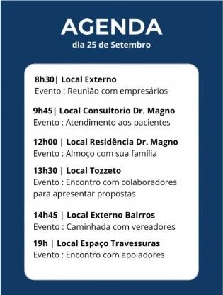 O candidato a prefeito de Ponta Grossa, Dr. Magno, iniciou sua agenda desta terça-feira (24) com atendimentos em seu consultório, onde conversou com pacientes e reforçou seu compromisso com a saúde pública. Ao meio-dia, ele se reuniu com sua família para um almoço em sua residência, destacando a importância dos valores familiares em sua vida pessoal e política. À tarde, Dr. Magno se juntou a vereadores de sua base em uma caminhada pelos bairros de Ponta Grossa. Durante o percurso, ele ouviu diretamente as demandas da população, reforçando sua proposta de uma gestão participativa e próxima dos cidadãos. A ação nos bairros teve como foco entender as necessidades locais e alinhar seu plano de governo às principais demandas dos moradores. Confira a agenda do candidato para esta quarta-feira (25): 08h30 - Local Externo Evento: Reunião com empresários. 09h45 - Local Consultório Dr. Magno Evento: Atendimento aos pacientes. 12h00 - Local Residência Dr. Magno Evento: Almoço com sua família. 13h30 - Local Tozetto Evento: Encontro com colaboradores para apresentar propostas. 14h45 - Local Externo Bairros Evento: Caminhada com vereadores. 19h - Local Espaço Travessuras Evento: Encontro com apoiadores.