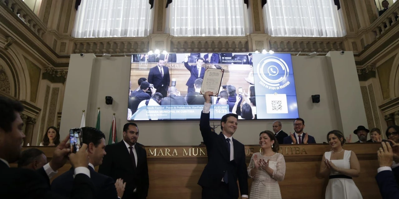 Na tarde desta quarta-feira (1º), Eduardo Pimentel Slaviero tomou posse como prefeito de Curitiba para o período 2025-2028, acompanhado de seu vice, Paulo Eduardo Martins. A cerimônia aconteceu na Câmara Municipal de Curitiba, com a presença dos 38 vereadores eleitos para a 19ª legislatura. Pimentel, que foi eleito em 27 de outubro com 57,64% dos votos válidos, assume o cargo aos 40 anos, após oito anos como vice-prefeito na gestão de Rafael Greca.