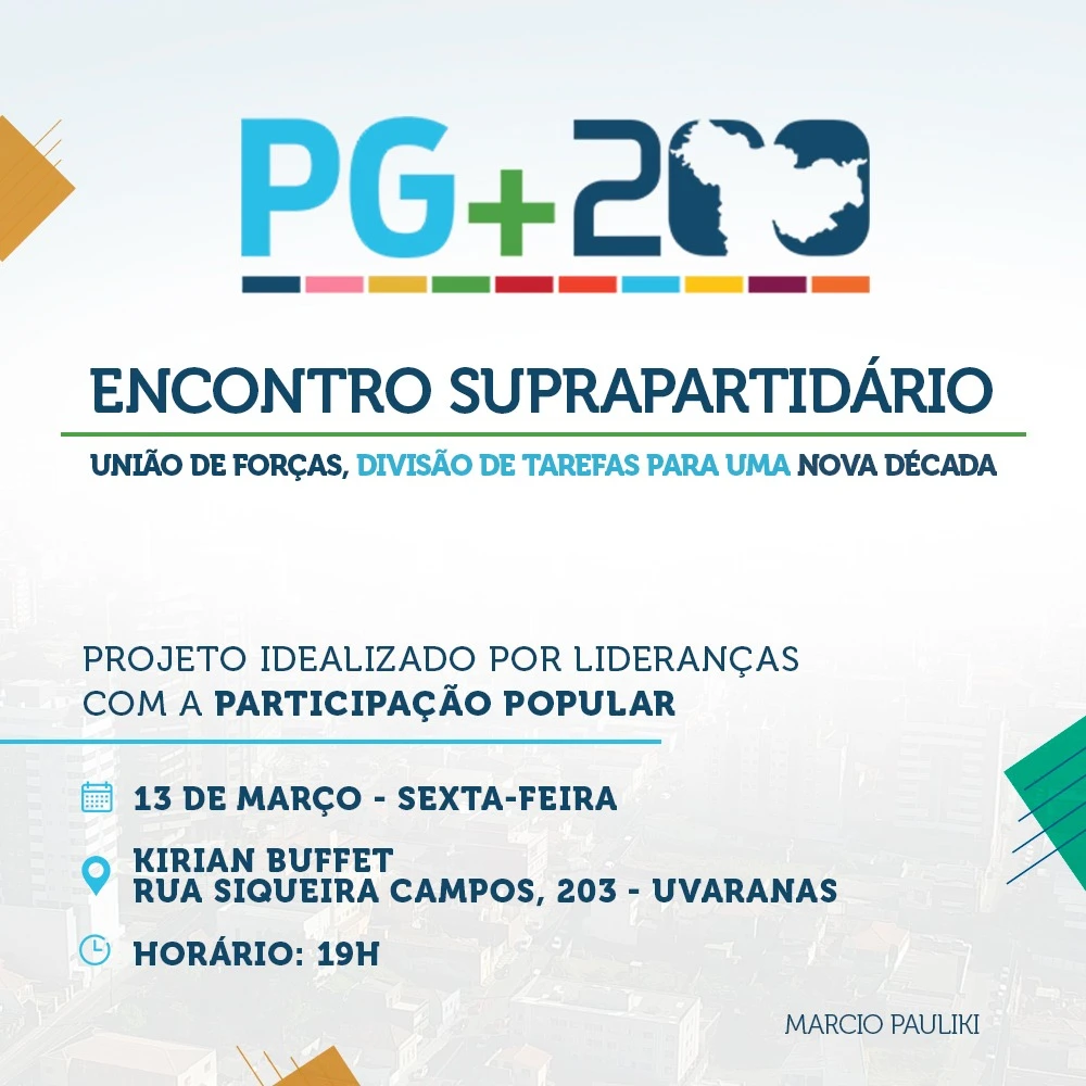 Acontece nesta sexta-feira (13) o evento 'PG+200', encontro suprapartidário voltado à discussão de ideias e sugestões feitas pela população para melhorias e avanços na cidade de Ponta Grossa. O projeto foi idealizado pelo pré-candidato a prefeito e empresário Marcio Pauliki (SD).