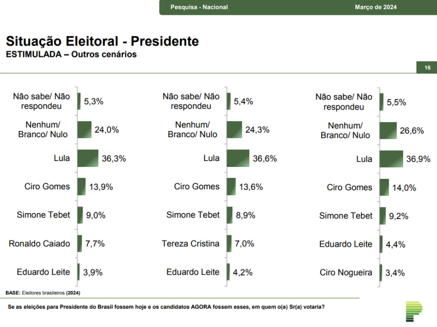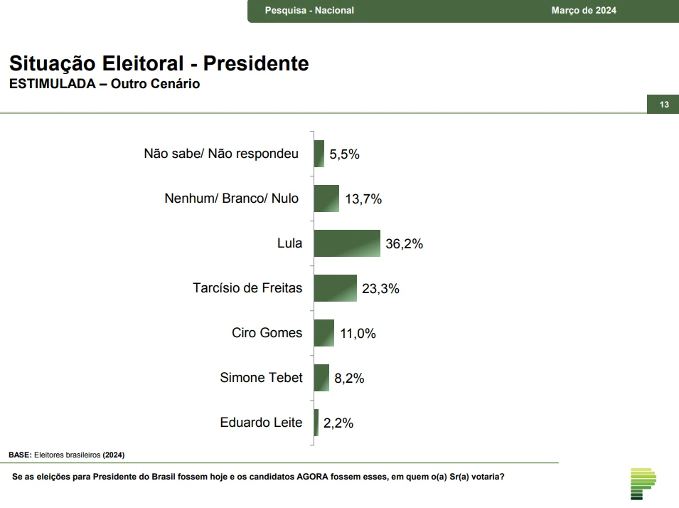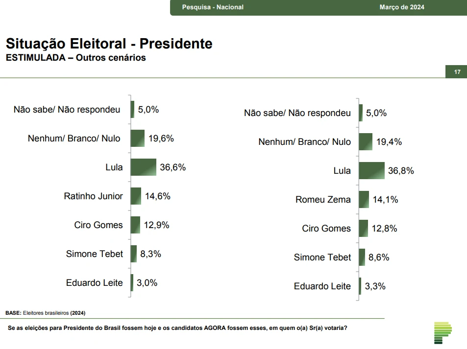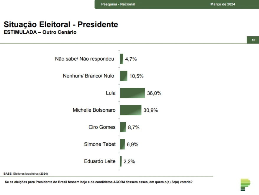 O único cenário proposto no qual o atual presidente poderia ser derrotado é contra Jair Bolsonaro. Nesta simulação, Lula consegue 35,3% dos votos e Bolsonaro 37,1%. Apesar de ter seu nome vinculado ao levantamento, o ex-presidente se encontra inelegível.