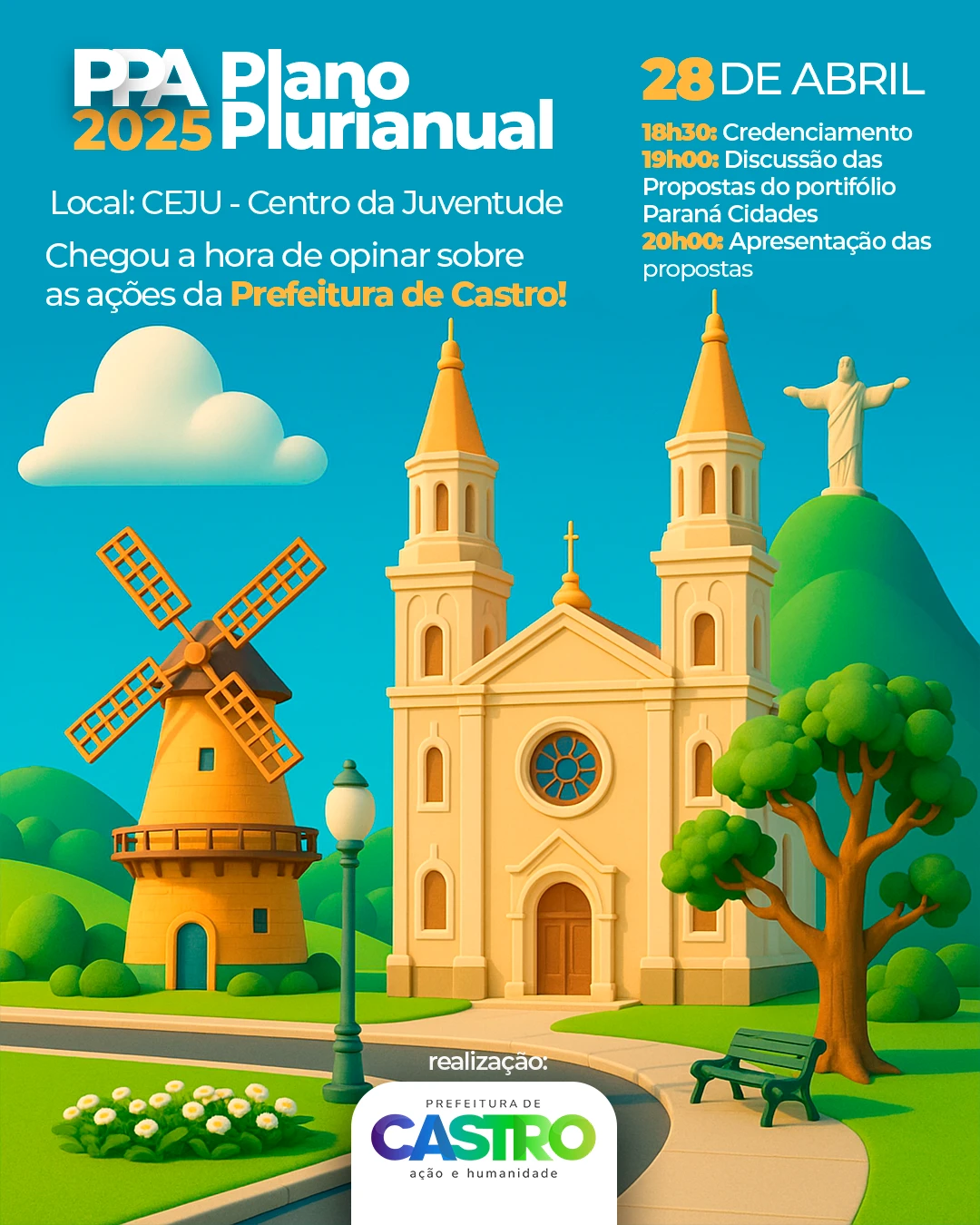 Esta será a primeira de uma série de consultas públicas previstas pela prefeitura para ampliar a participação popular na construção dos instrumentos de planejamento e gestão da cidade. "A participação é bem simples e, durante a audiência, as pessoas saberão como contribuir. Essa é a oportunidade certa para quem tem vontade de caminhar junto com a gestão, dar sua opinião e elencar as prioridades, pensando no presente e no futuro de Castro", indica Rodrigo.