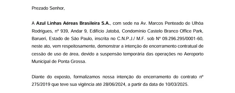 A medida ocorre após a própria Azul comunicar, em fevereiro, o encerramento definitivo de suas atividades em Ponta Grossa a partir de 10 de março de 2025. A decisão da empresa faz parte de um plano nacional de reestruturação, que incluiu a suspensão de voos em 12 cidades brasileiras. Entre os motivos alegados pela companhia estão o aumento dos custos operacionais, a alta do dólar, a crise global na cadeia de suprimentos e a necessidade de priorizar rotas mais rentáveis.