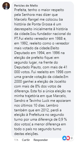 No comentário da postagem original, o ex-prefeito afirma que "dizer que Marcelo Rangel me colocou na história de Ponta Grossa é um desrespeito inicialmente à história da cidade", comenta enfatizando momentos importantes de sua trajetória política, em que não teve ligação com os irmãos Oliveira.