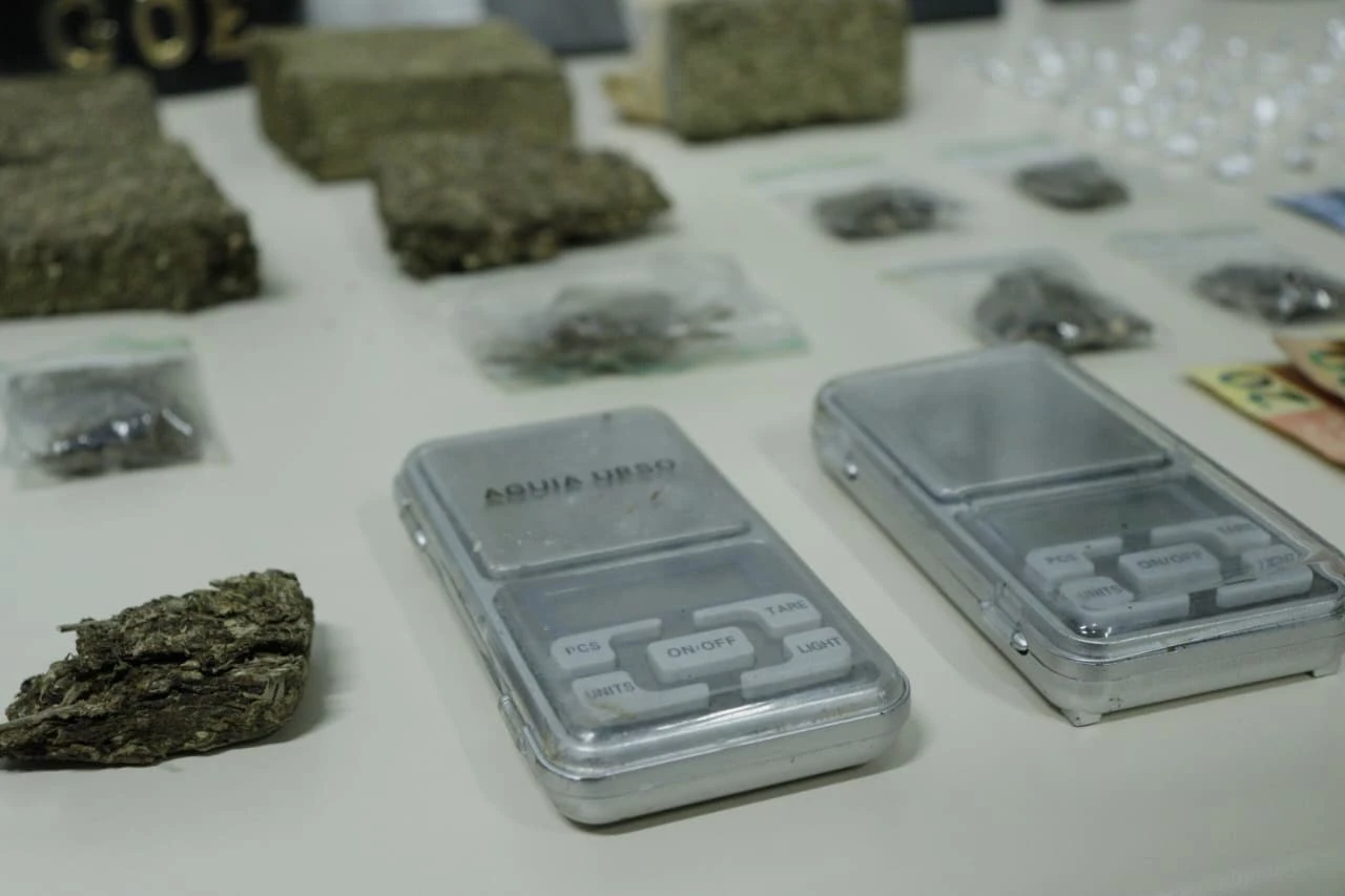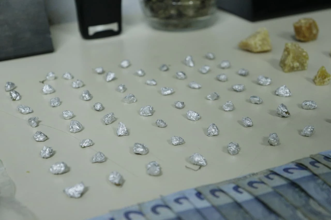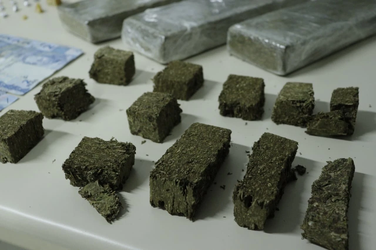 Foram apreendidos seis quilos de substância análoga a maconha; 100 gramas de substância análoga a crack; dinheiro trocado (característico de tráfico de drogas); duas balanças de precisão e um rádio comunicador.