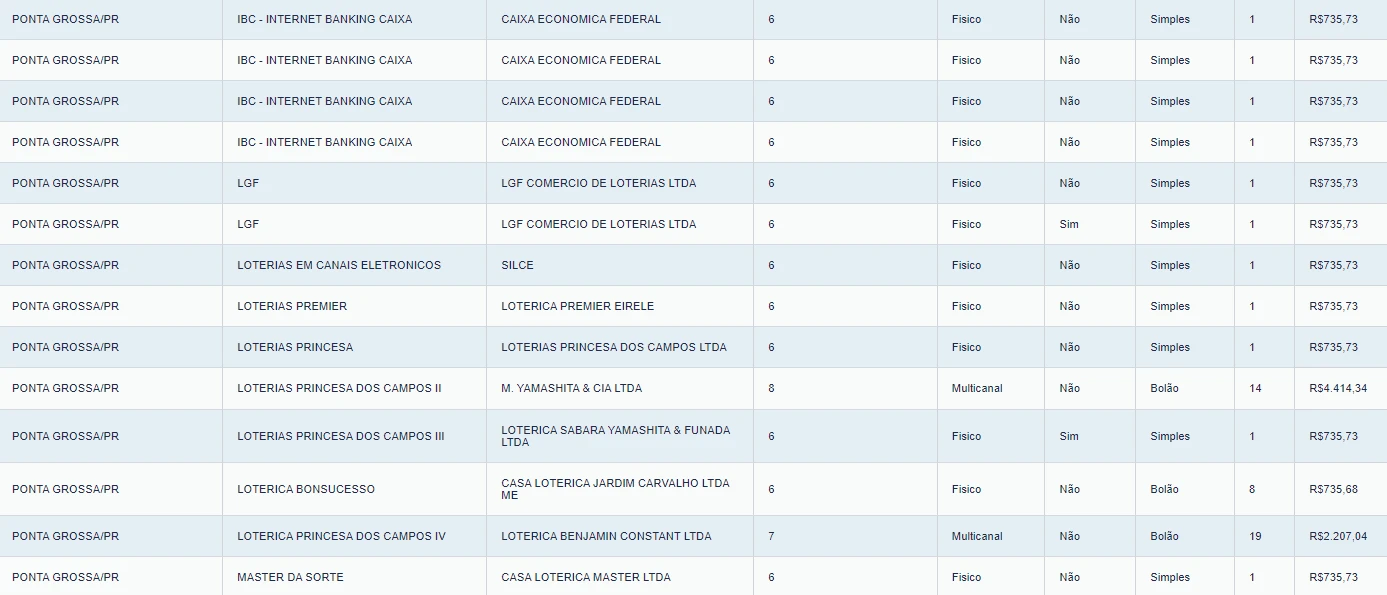 Em todo o país, 138 apostas acertaram cinco números e levarão R$ 22.307,65 cada. Outras 6.897 apostas acertaram quatro dezenas e receberão o mesmo valor das apostas de Ponta Grossa.
