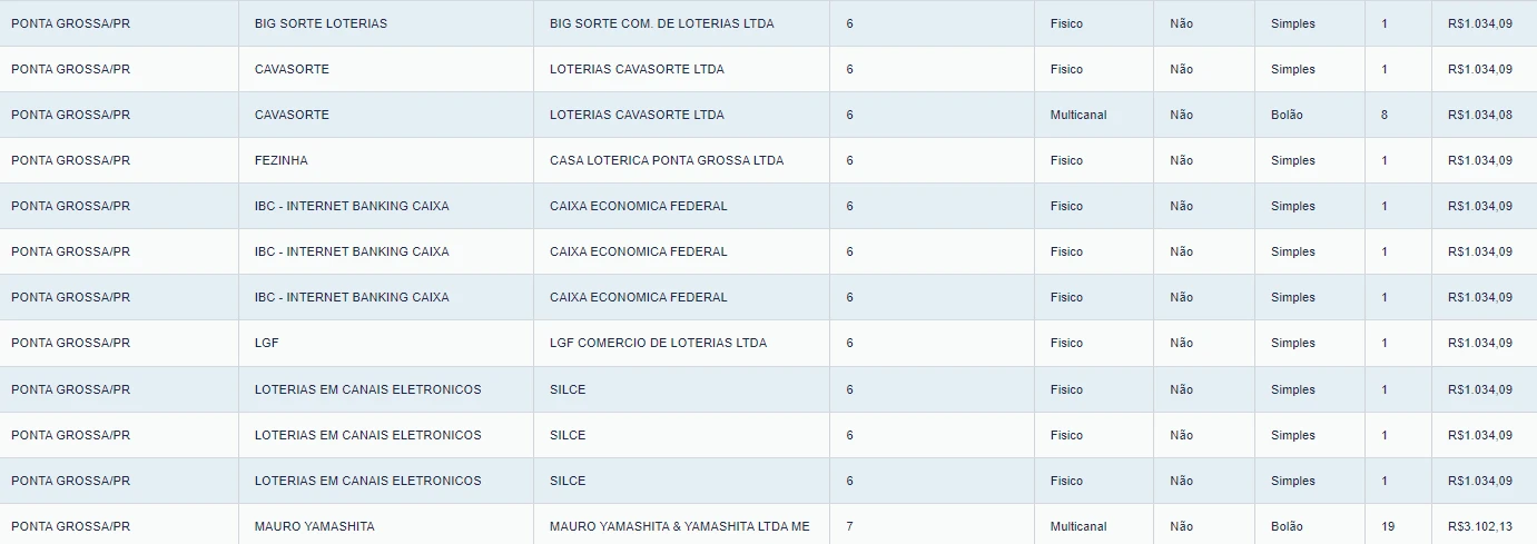 A cidade de Ponta Grossa teve 12 apostas vencedoras na quadra do concurso 2.979 da Mega-Sena, sorteado nesta terça-feira (3). No total foram 10 apostas simples e dois bolões. Cada uma das apostas que acertou quatro dezenas irá receber R$ 1.034,09 - um dos bolões receberá R$ 3.102,13