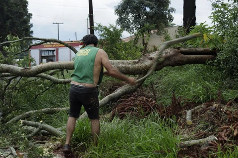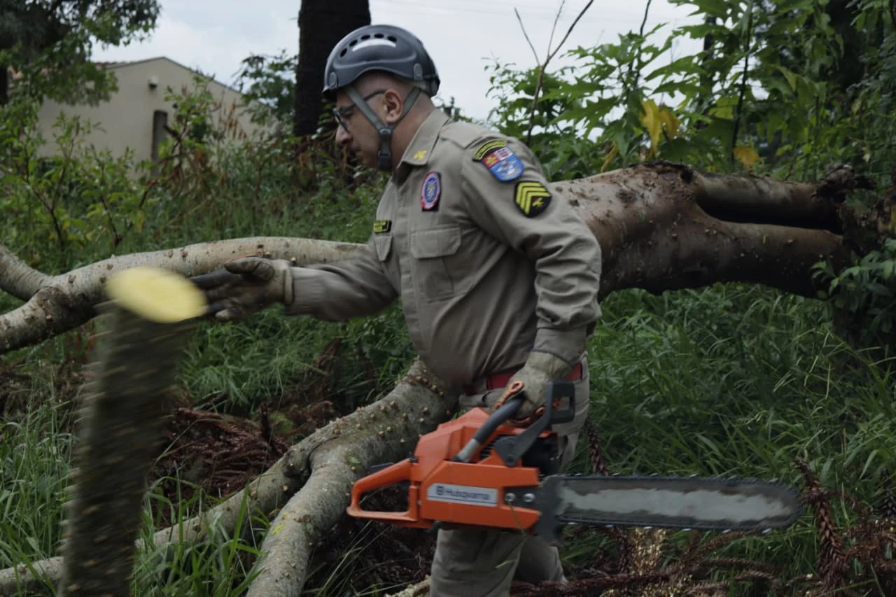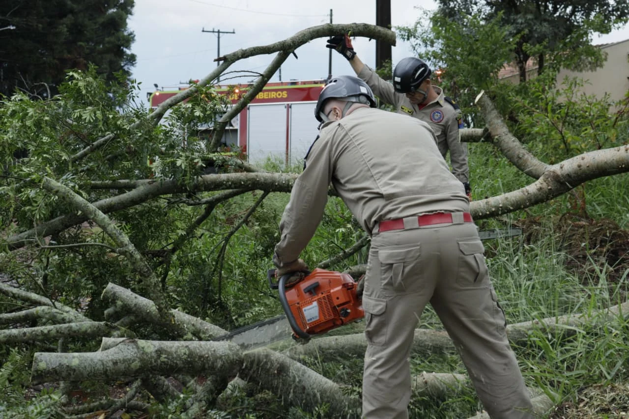 Após a chuva registrada na tarde desta quinta-feira (29) em Ponta Grossa, o Corpo de Bombeiros foi acionado para auxiliar um morador na corte e poda de uma árvore caída. A localidade está na região do bairro Cará-Cará, em uma rua sem asfaltamento.