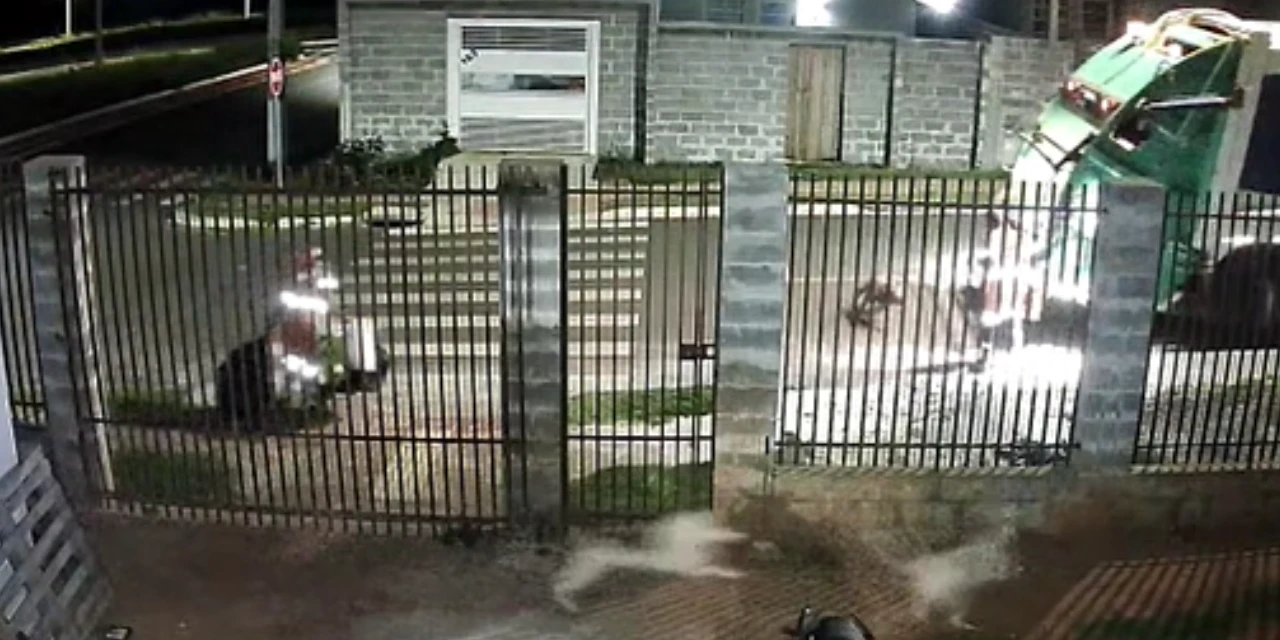 A situação ocorreu às 21h07. Nas imagens, é possível ver o momento em que o caminhão de coleta de resíduos para na via e os coletores descem do veículo para realizar o trabalho. Após alguns segundos, eles são surpreendidos pela chegada do animal, que avança em direção a um dos trabalhadores.