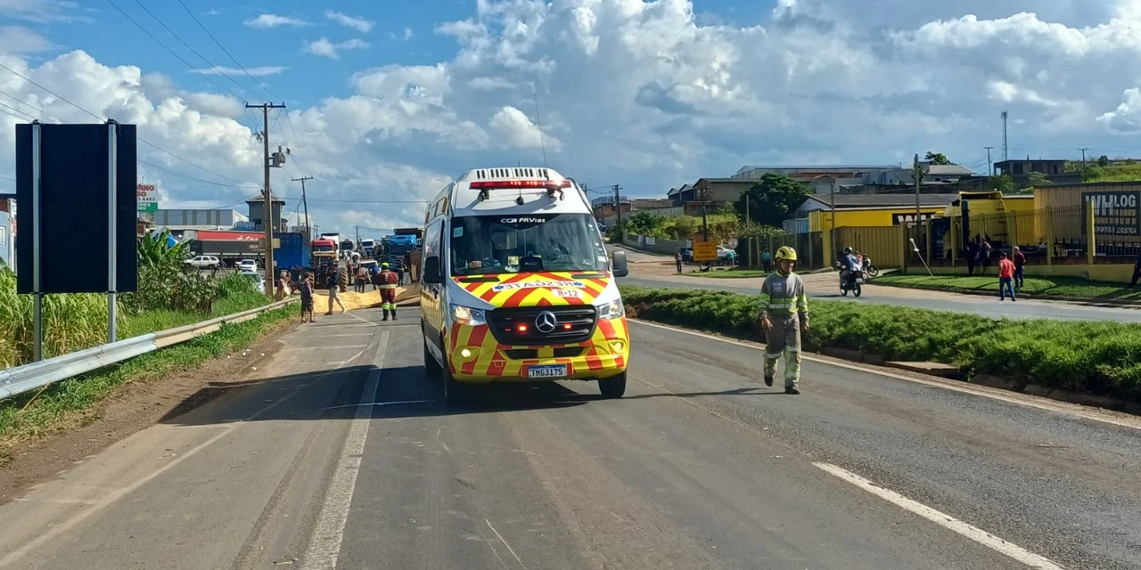Um motociclista de 21 anos, que seguia no sentido atingido, conseguiu desviar da carga derramada, mas perdeu o controle da direção e caiu.