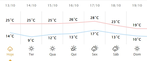 No dia seguinte, porém, o Simepar indica que as chuvas retornam e o tempo deve ficar com parcialmente nublado. O clima fechado deve se manter no sábado, com possibilidade de chuva e temperaturas entre 23 e 13ºC. No domingo, a expectativa é que o sol volte a aparecer, mas as temperaturas ficam amenas - a máxima deve ser de 19ºC e a mínima de 10ºC.
