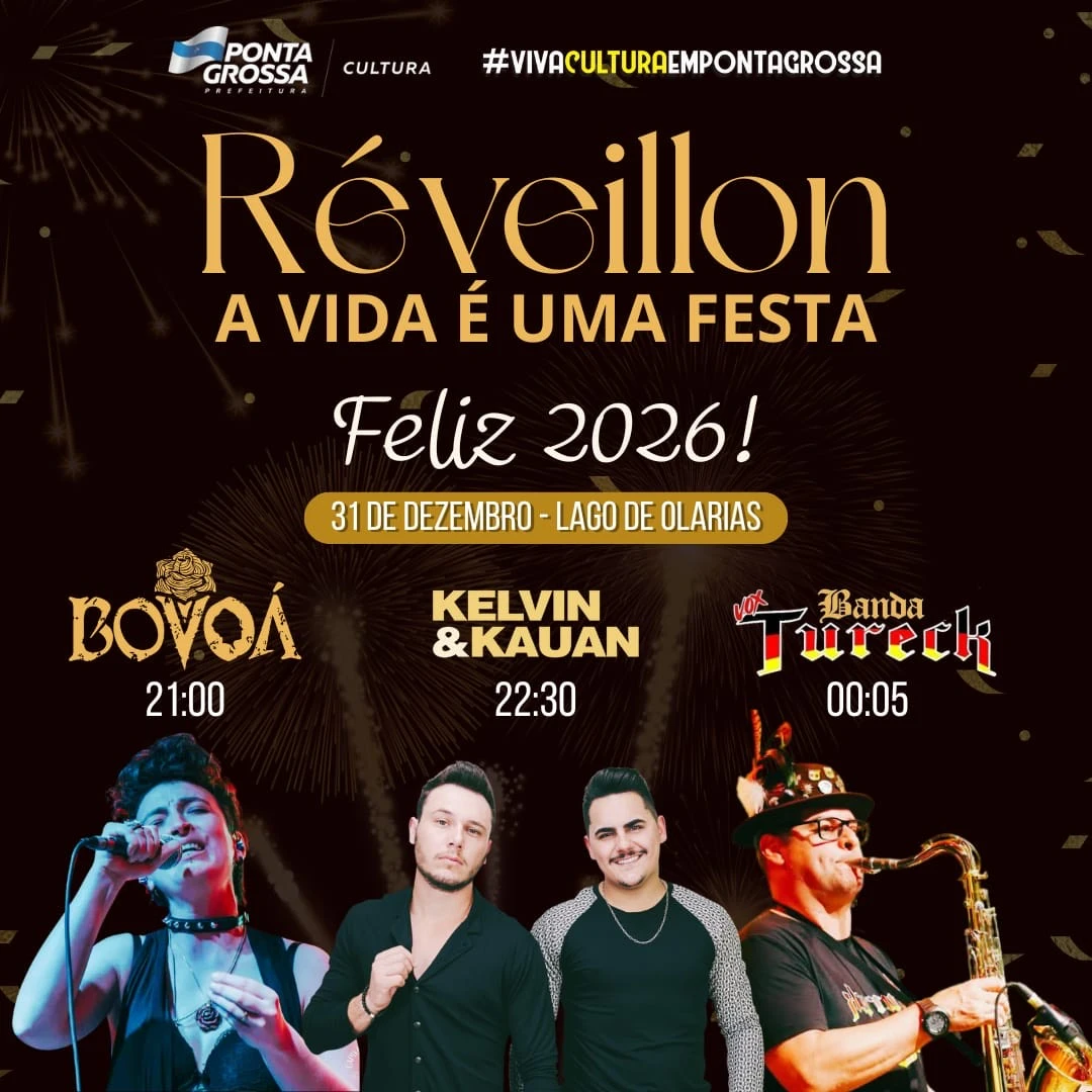 Segundo a Prefeitrura de Ponta Grossa, o Palco Réveillon inicia às 21h com Bovoá, seguido, às 22h30, pela dupla Kelvin & Kauan. Após a virada do ano, às 00h05, a banda Vox Turek encerra a programação. A orientação é para que o público chegue com antecedência, garantindo mais conforto e segurança.