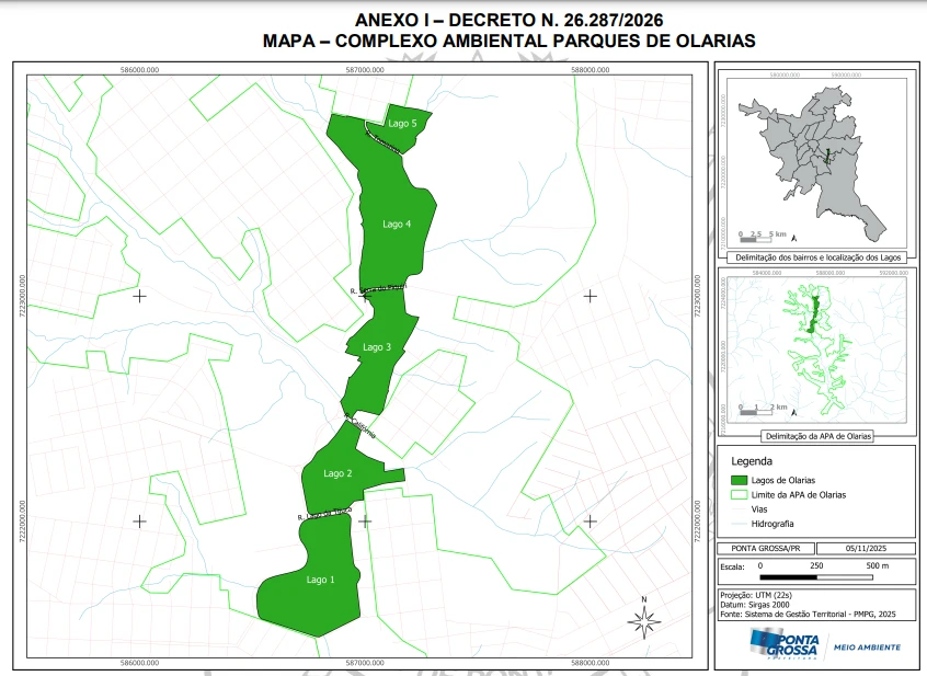 A Prefeitura de Ponta Grossa, por meio do Decreto nº 26.287, sancionado em 5 de fevereiro de 2026 e publicado no Diário Oficial desta quarta-feira (11), instituiu oficialmente o Complexo Ambiental Lagos de Olarias, parque linear localizado na Área de Proteção Ambiental da Bacia do Arroio de Olarias (APA de Olarias). O espaço ocupa aproximadamente 58,78 hectares e contará, no total, com cinco lagos artificiais, estruturas de lazer, esporte e contemplação, além de áreas voltadas à educação ambiental e pesquisa científica.