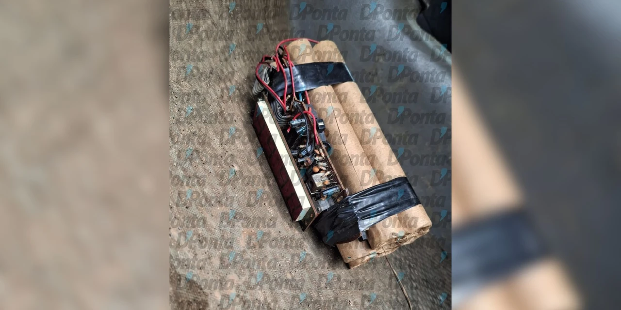 O D'Ponta News teve acesso exclusivo a uma imagem do artefato que mobilizou as forças de segurança no bairro de Uvaranas, em Ponta Grossa, na tarde desta segunda-feira (19). A foto mostra um dispositivo composto por tubos cilíndricos na cor parda, unidos por fita isolante preta, conectados a fios vermelhos e a uma placa de circuito eletrônico com display digital, assemelhando-se visualmente a uma bomba relógio ou dinamite.