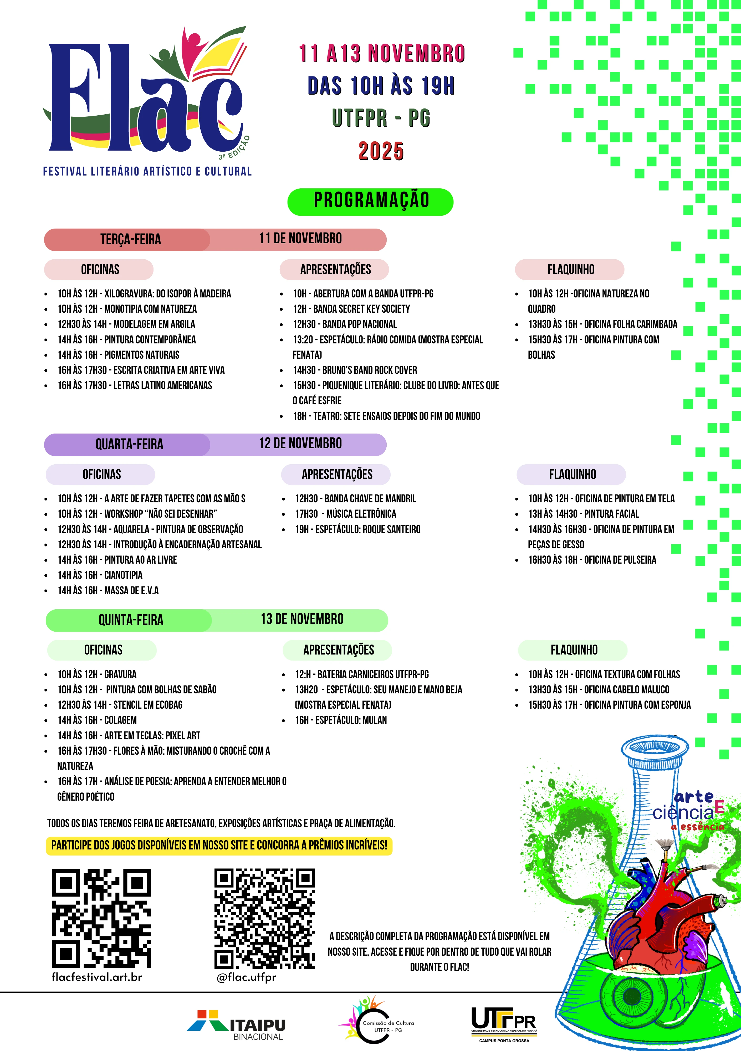 De 11 a 13 de novembro, o Campus Ponta Grossa da Universidade Tecnológica Federal do Paraná (UTFPR) será palco do Festival Literário Artístico e Cultural (FLAC 2025), um dos eventos mais aguardados do calendário cultural da instituição. Promovido pela Comissão de Cultura do campus, o festival convida a comunidade acadêmica e externa para três dias de imersão nas diversas linguagens da arte, com programação gratuita que inclui oficinas, exposições, apresentações musicais, performances teatrais e atividades criativas.
