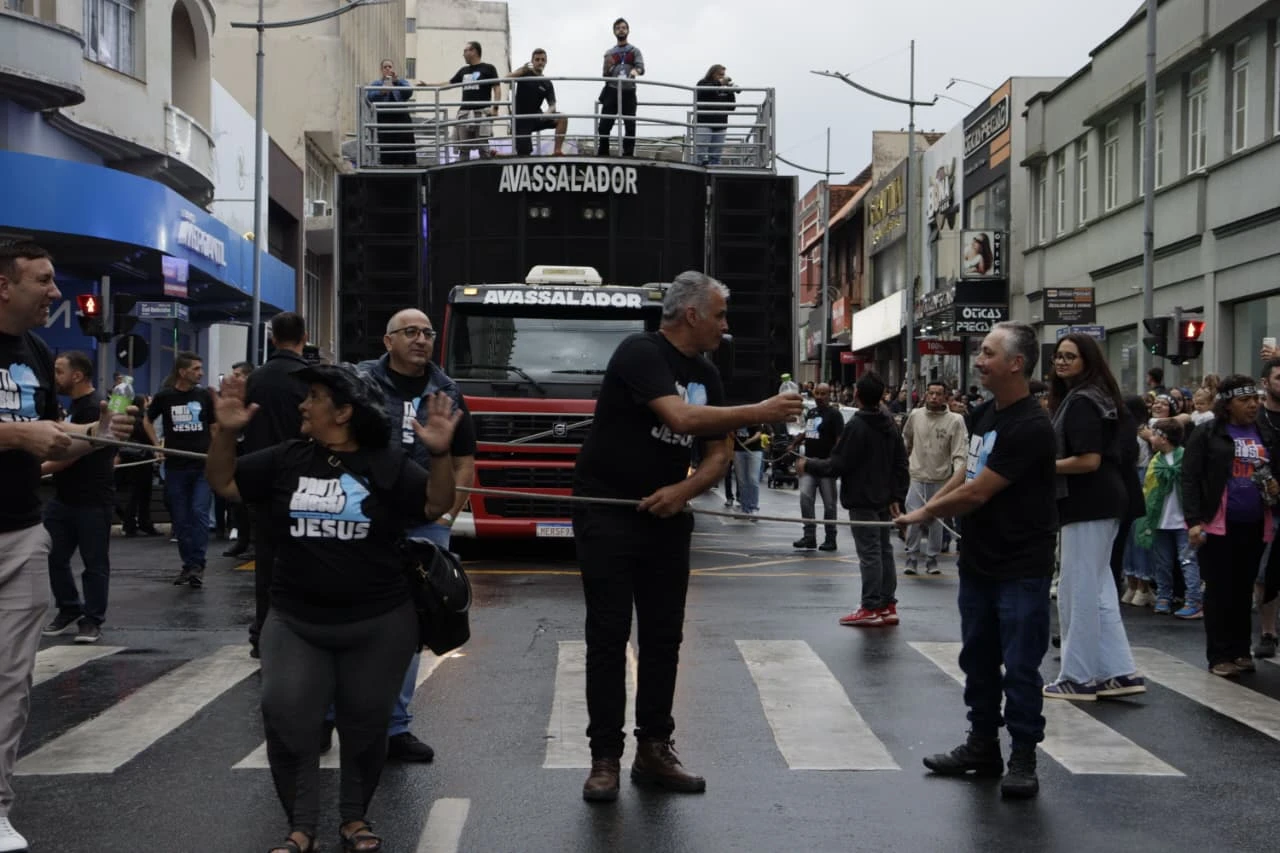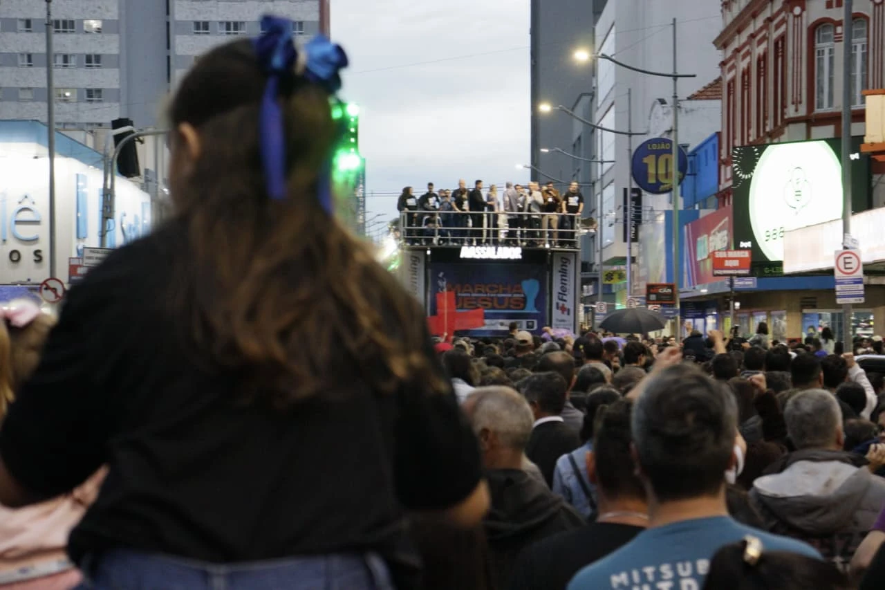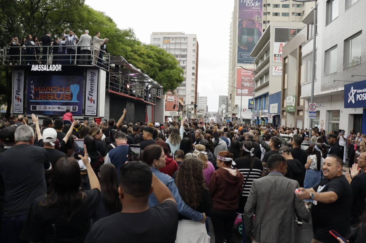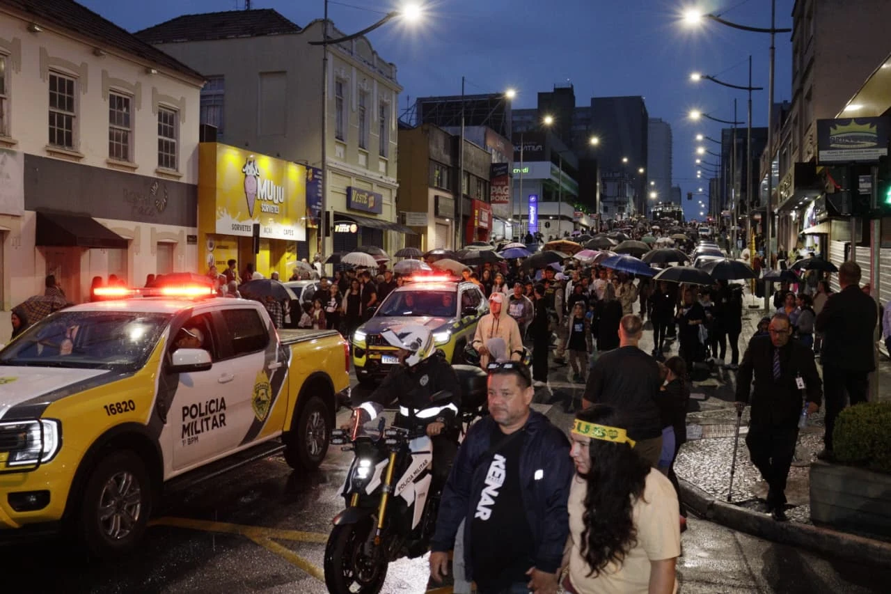O evento contou com apoio da Equipe de Patrulhamento Viário de Trânsito, garantindo segurança ao longo do percurso, e reuniu famílias adorando, com gestos de fé com as mãos erguidas e filhos nas costas de pais e mães para acompanharem os momentos de louvor. A caminhada se estendeu pela Avenida Vicente Machado, na região central da cidade, proporcionando momentos de reflexão e comunhão entre os participantes.