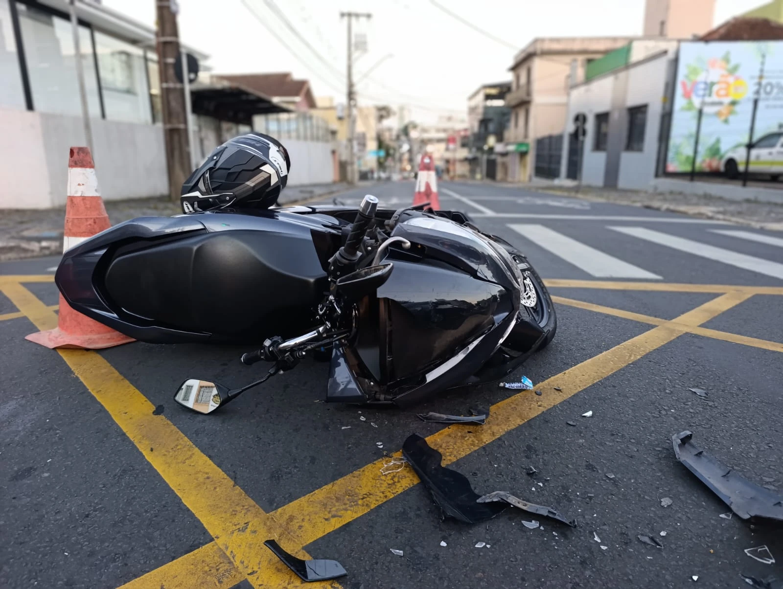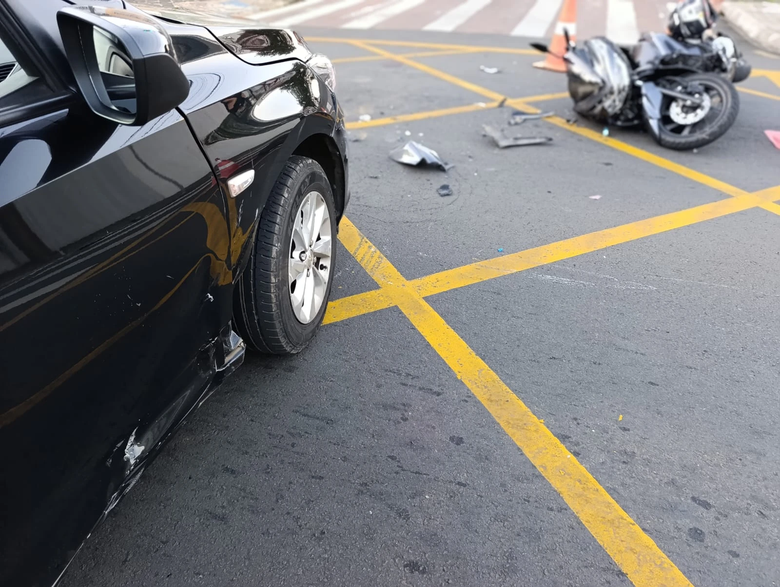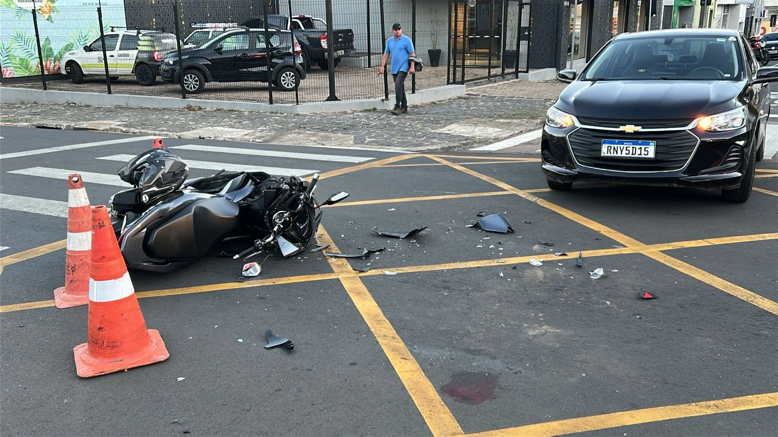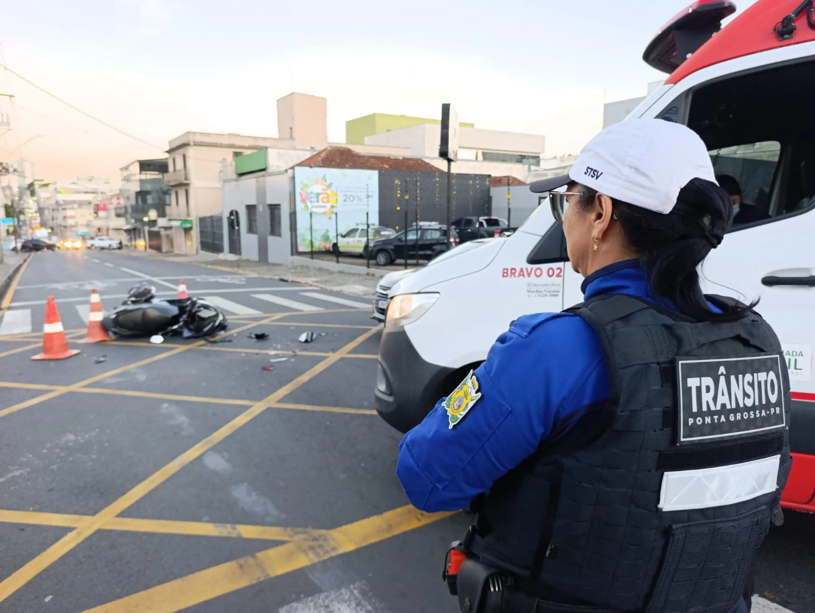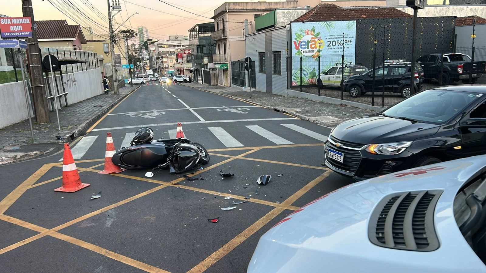 Um acidente envolvendo um carro e uma motocicleta foi registrado na tarde desta segunda-feira (10) no centro de Ponta Grossa. A batida ocorreu no cruzamento entre as ruas Santos Dumont e Comendador Miró.